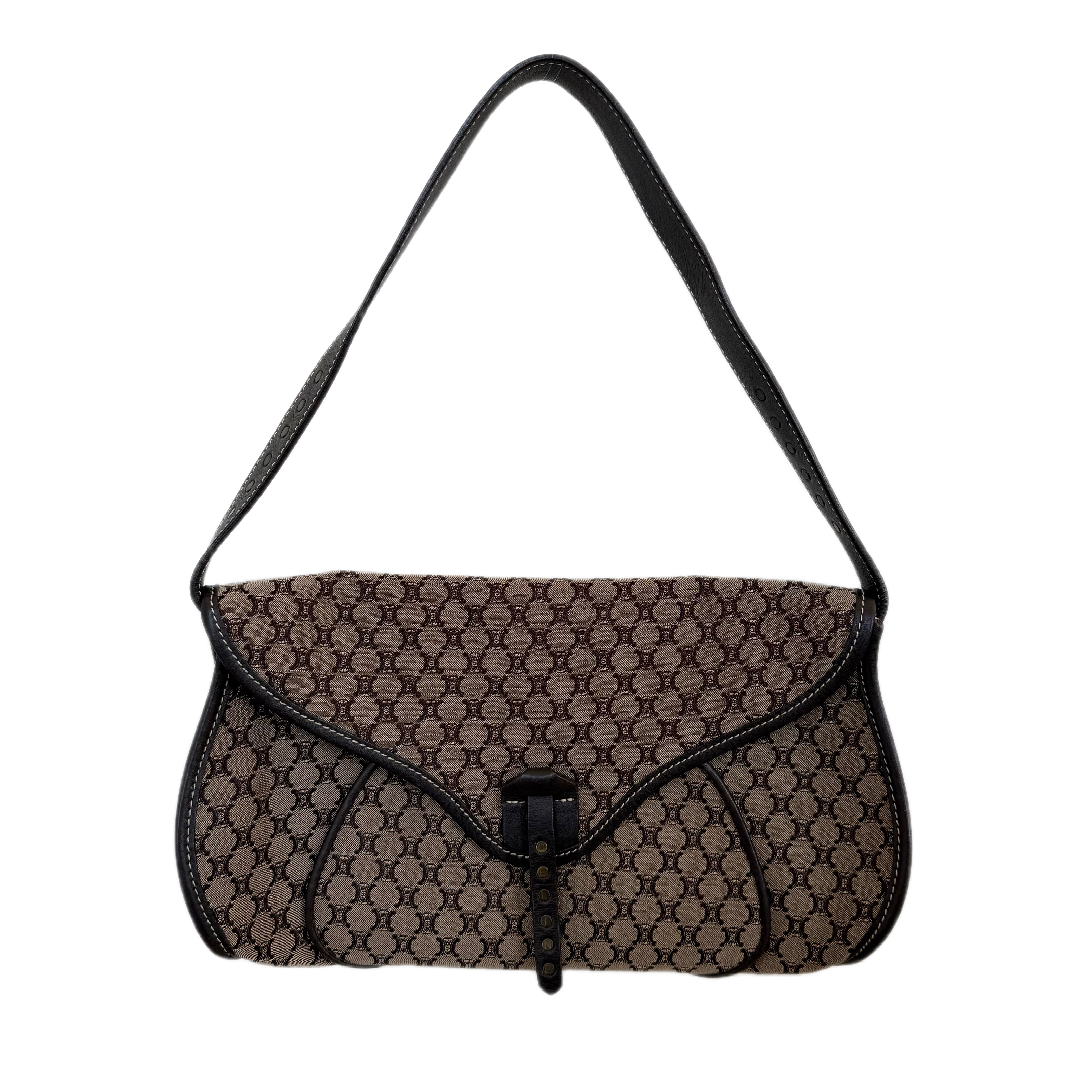 Céline Macadam Canvas Shoulder Bag in Brown with Black Leather Trim