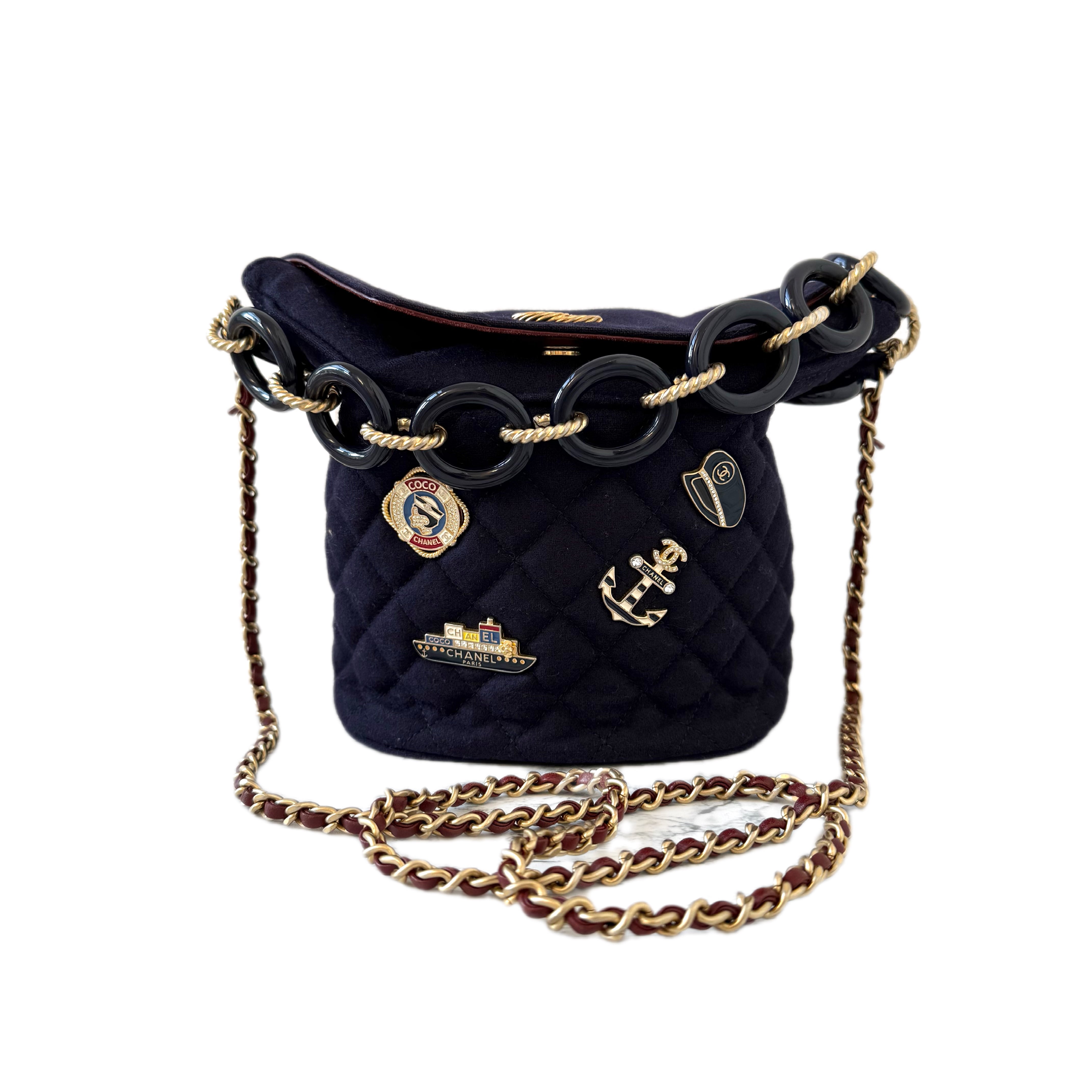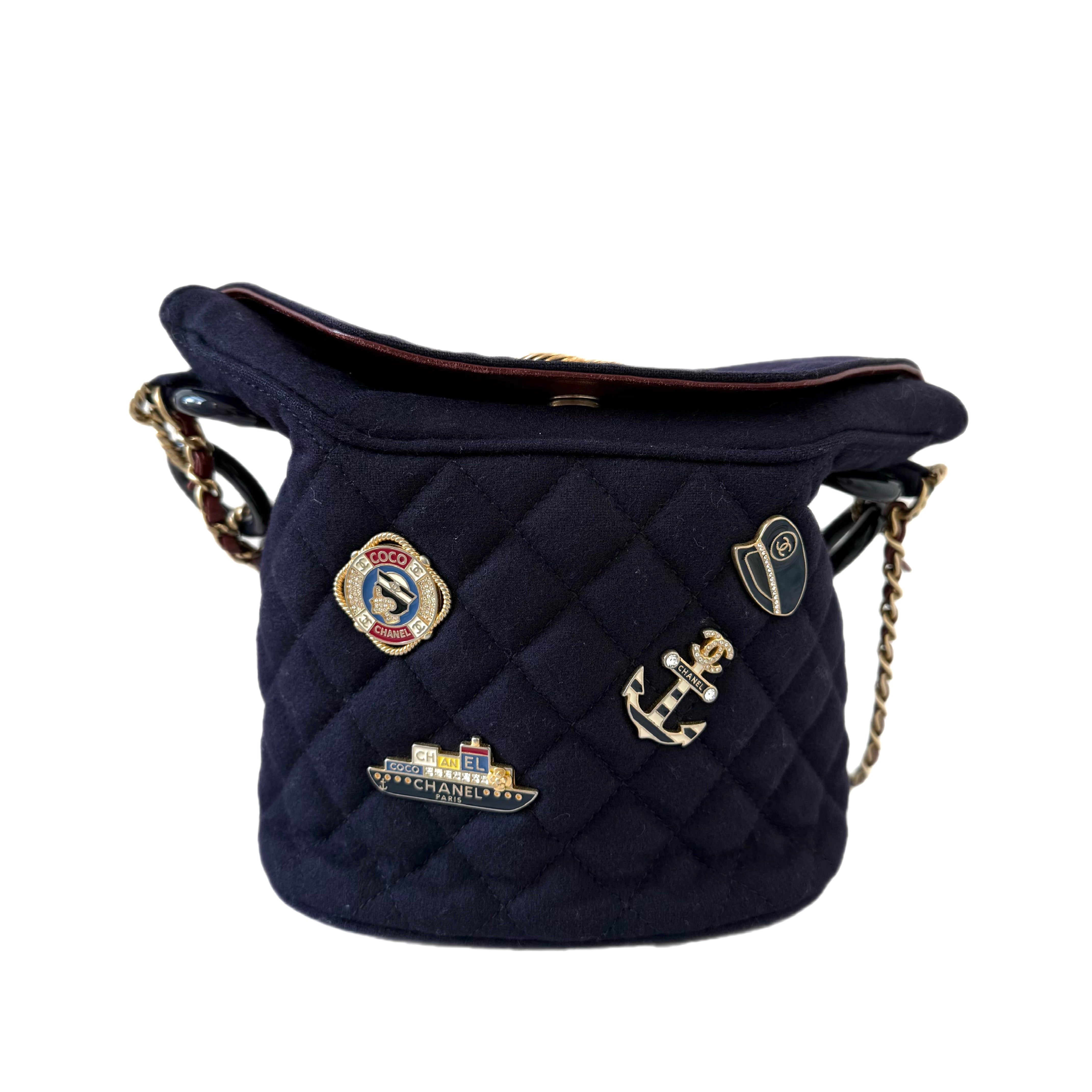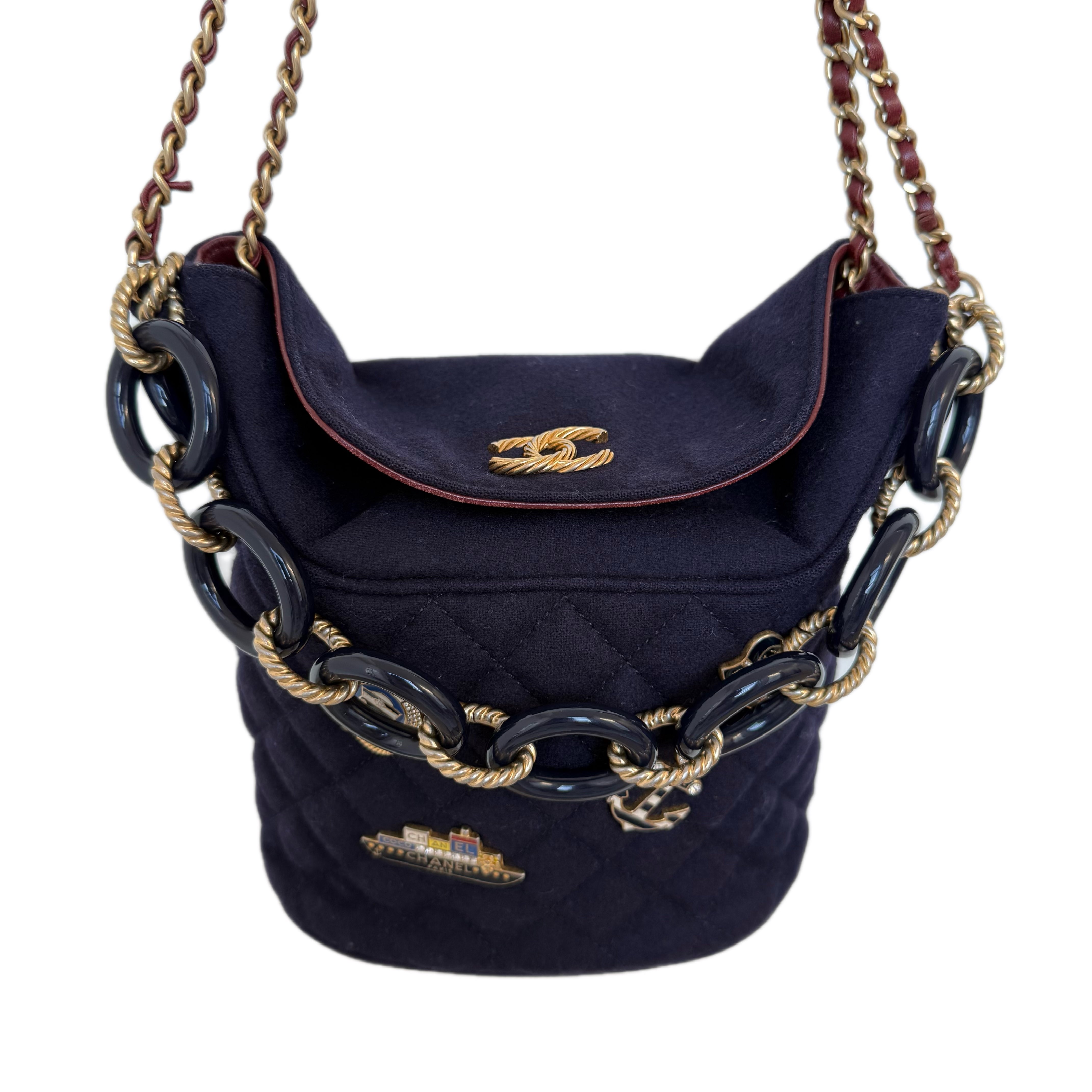 Chanel Paris–Hamburg Charms wool bucket bag in navy blue. Rare Métiers d’Art archival piece with signature charm detailing.
