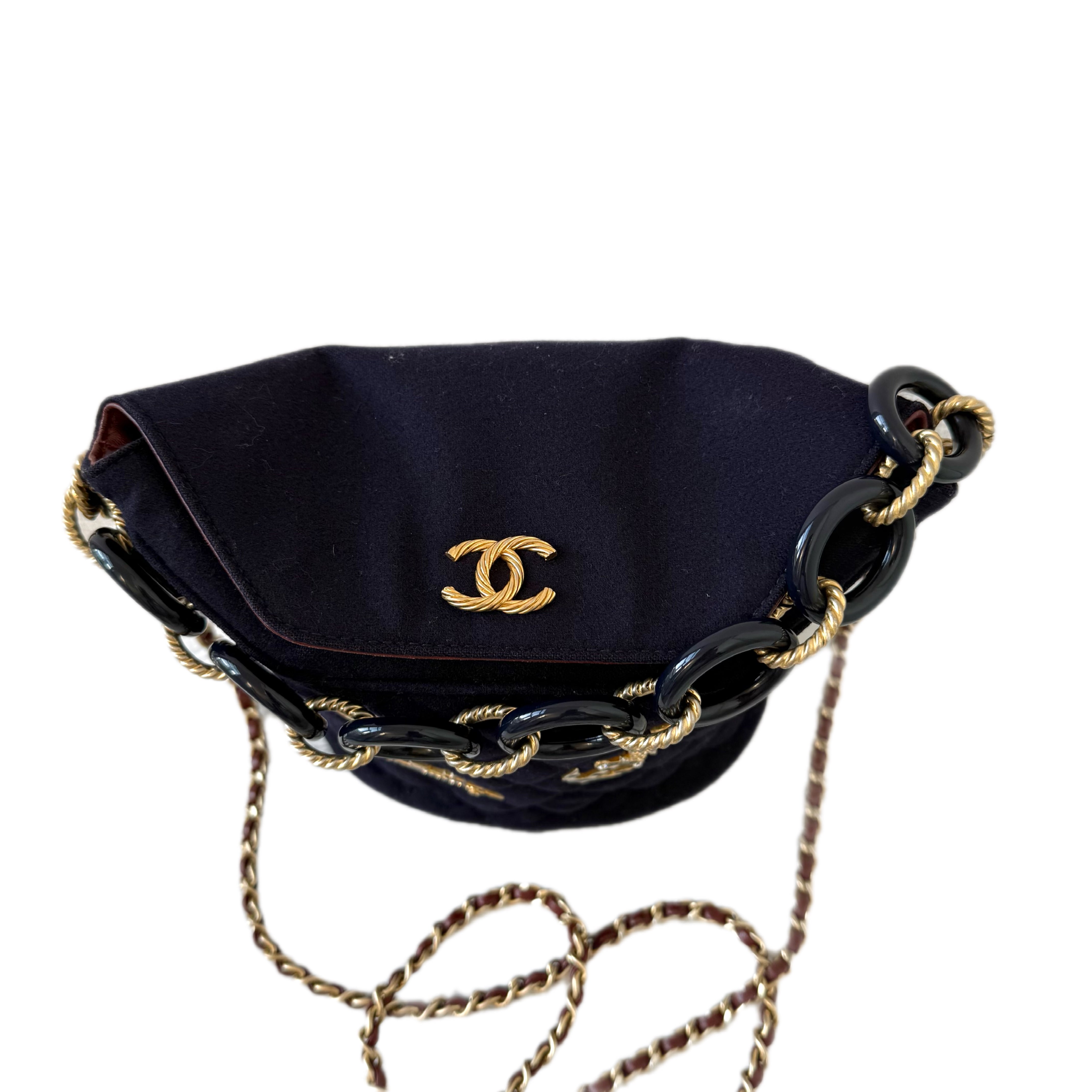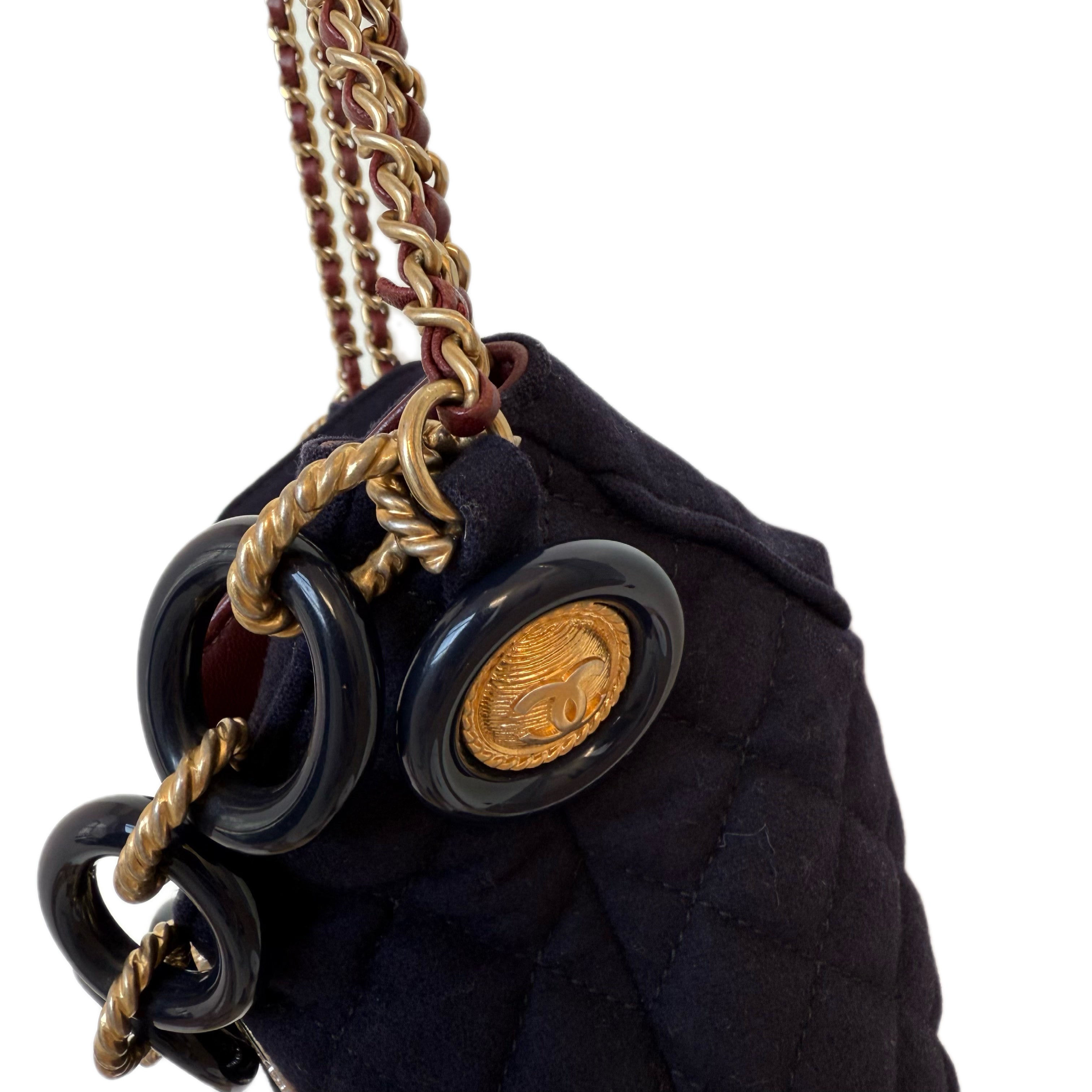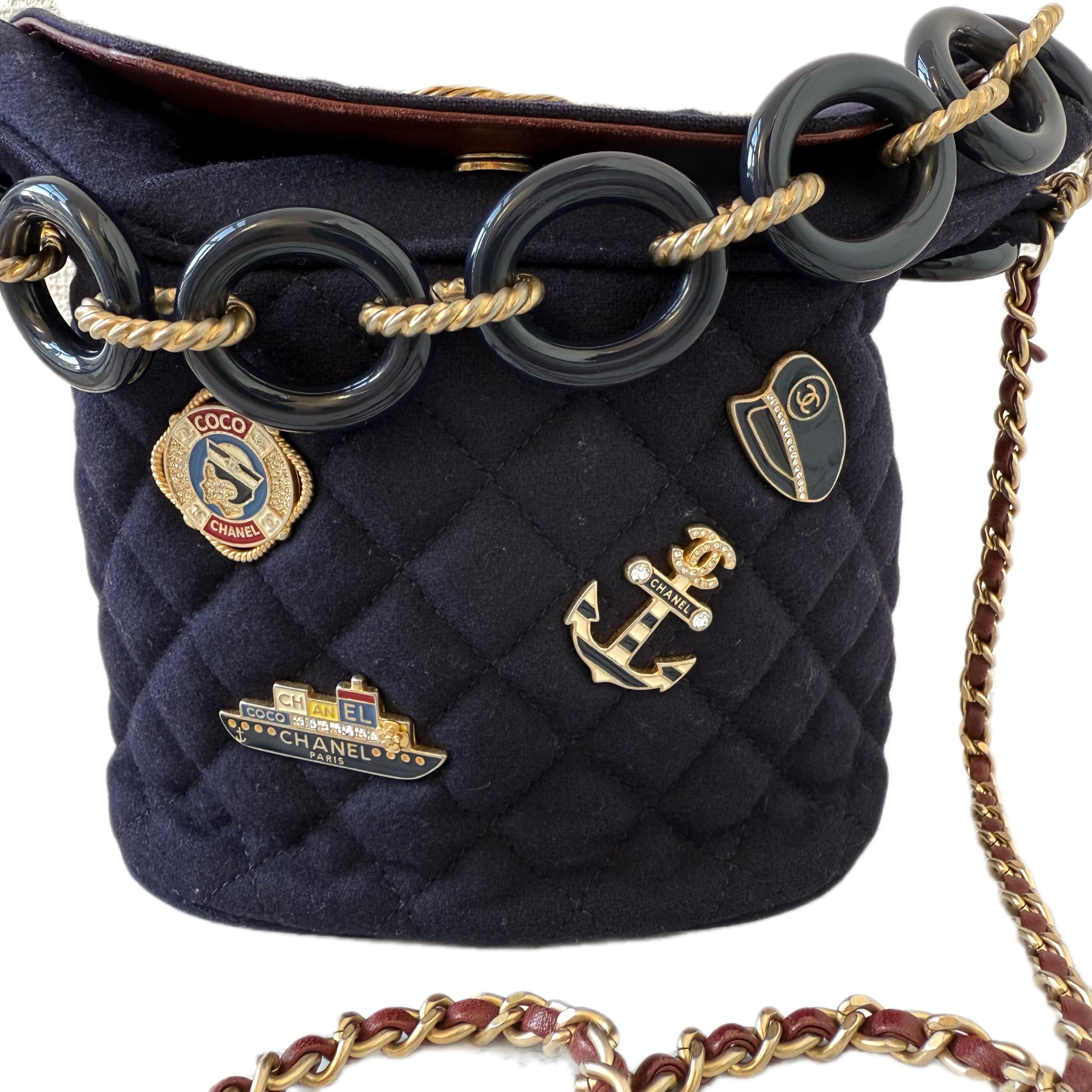 Chanel Paris–Hamburg Charms wool bucket bag in navy blue. Rare Métiers d’Art archival piece with signature charm detailing.