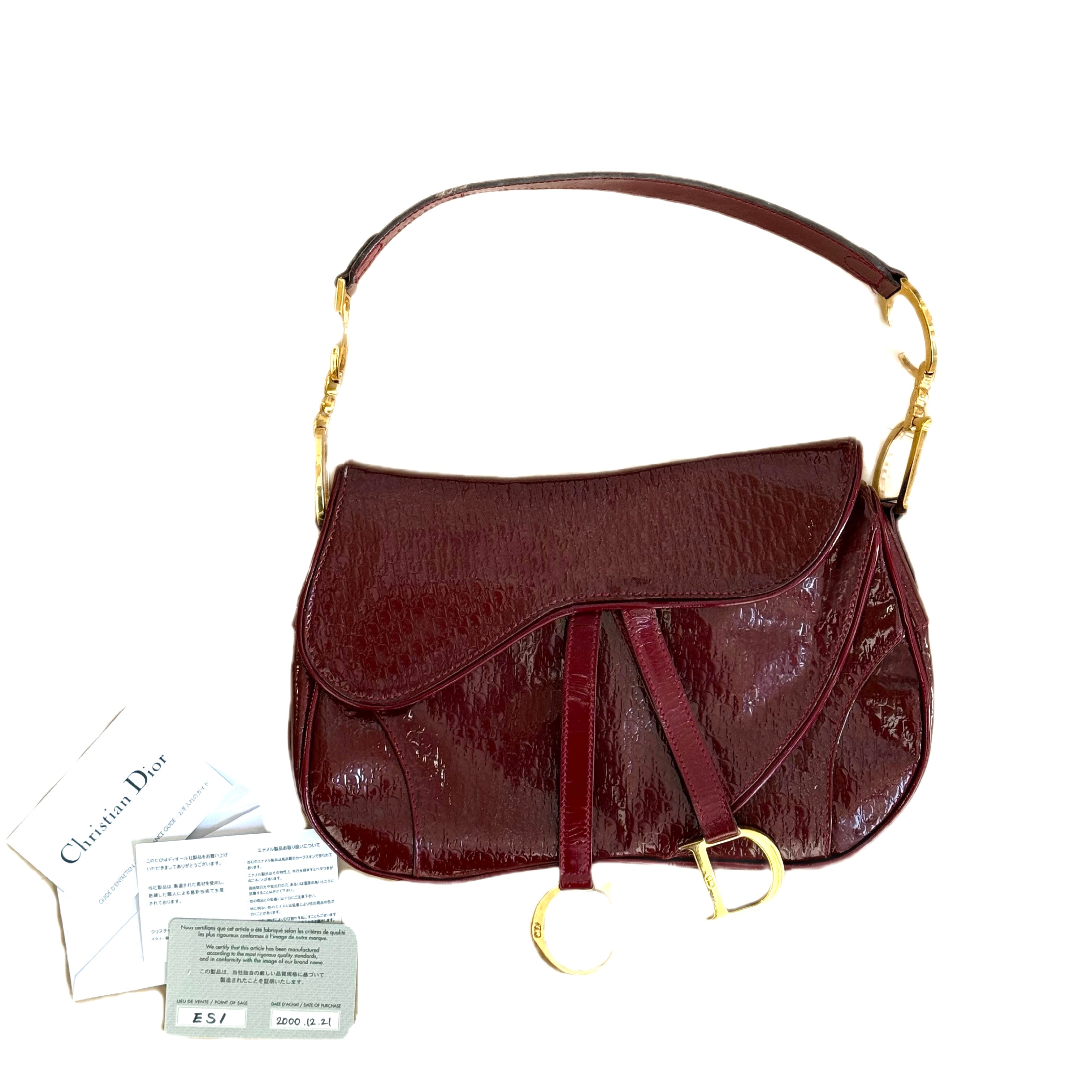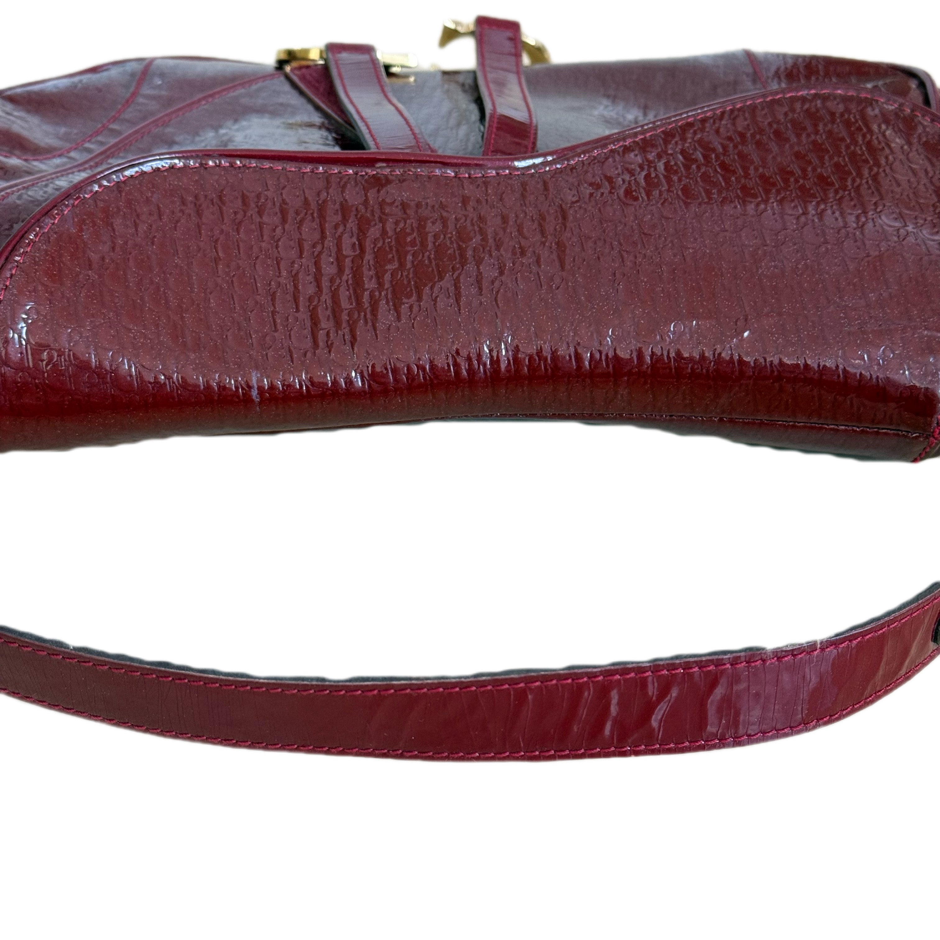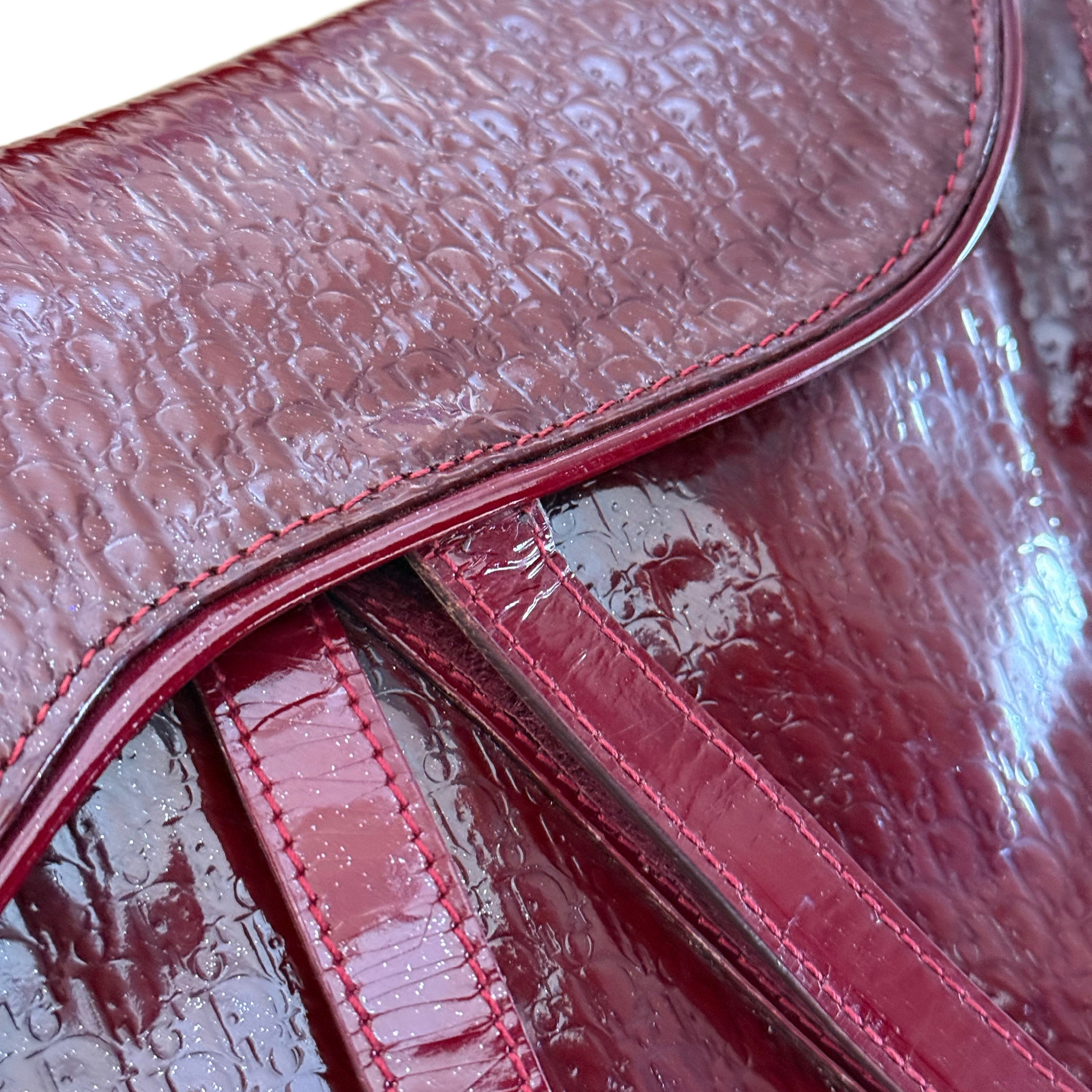 Christian Dior Vintage Double Saddle Bag in Burgundy Embossed Patent Diorissimo Leather