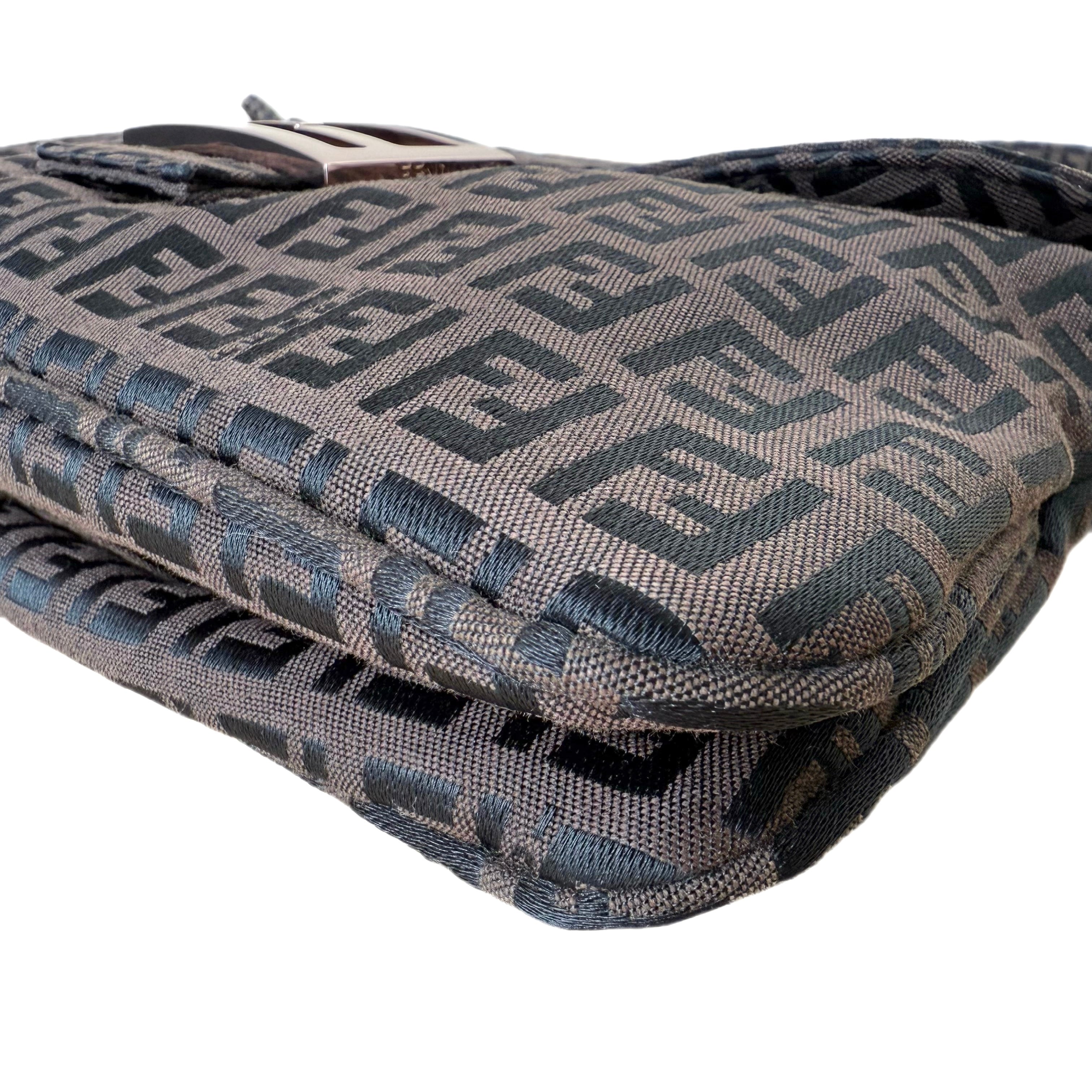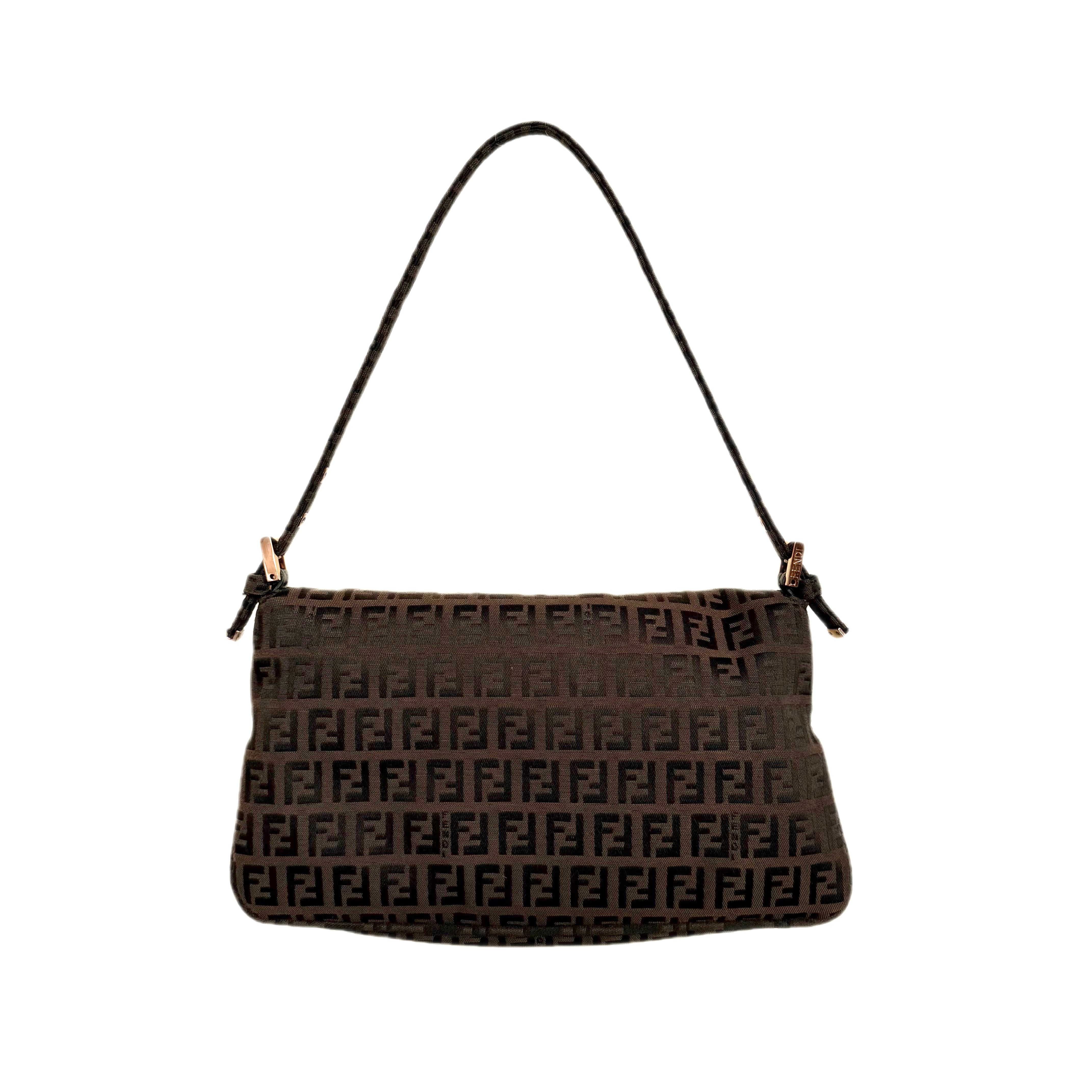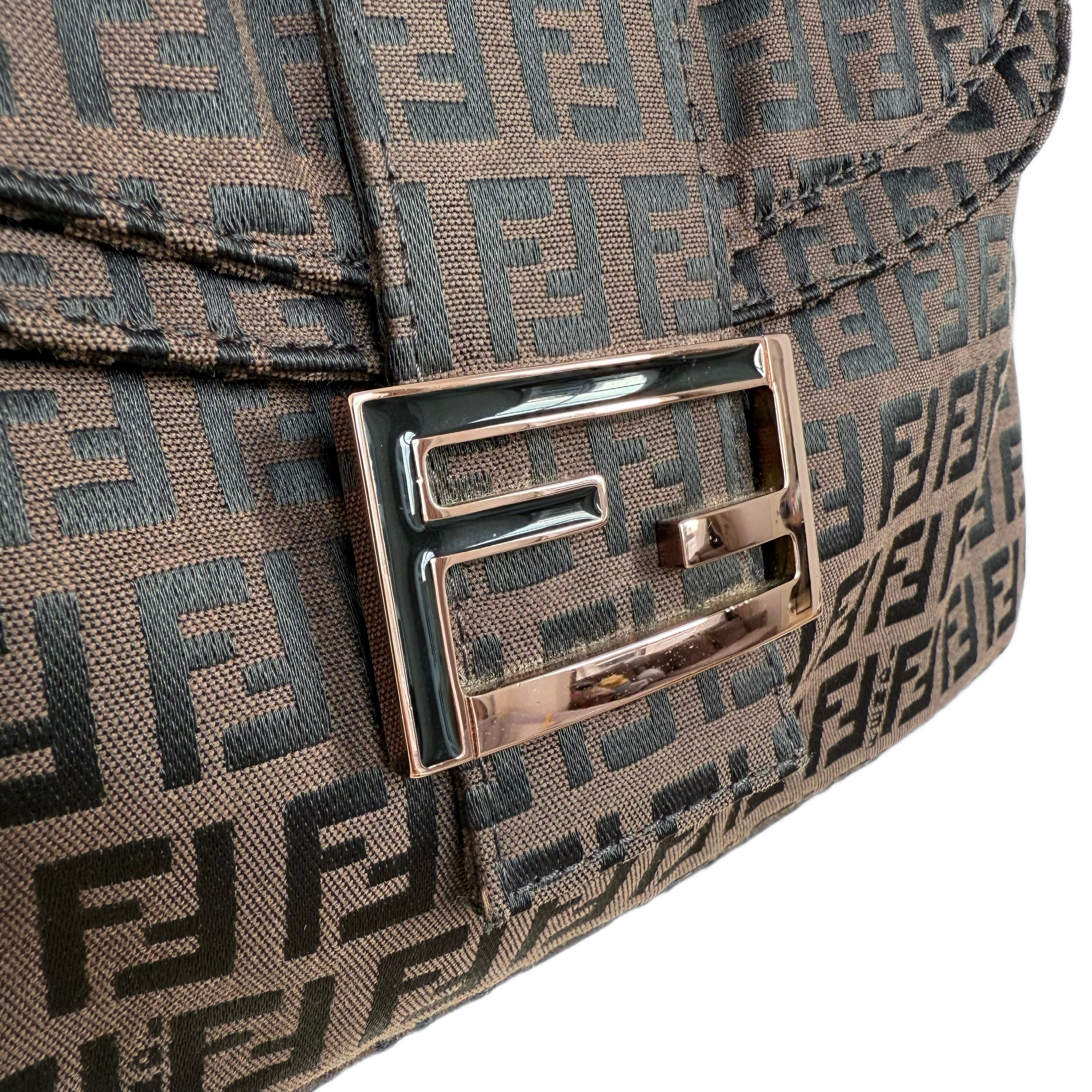 Fendi Zucchino canvas baguette shoulder bag in brown and black. Classic monogram design in an iconic silhouette.