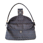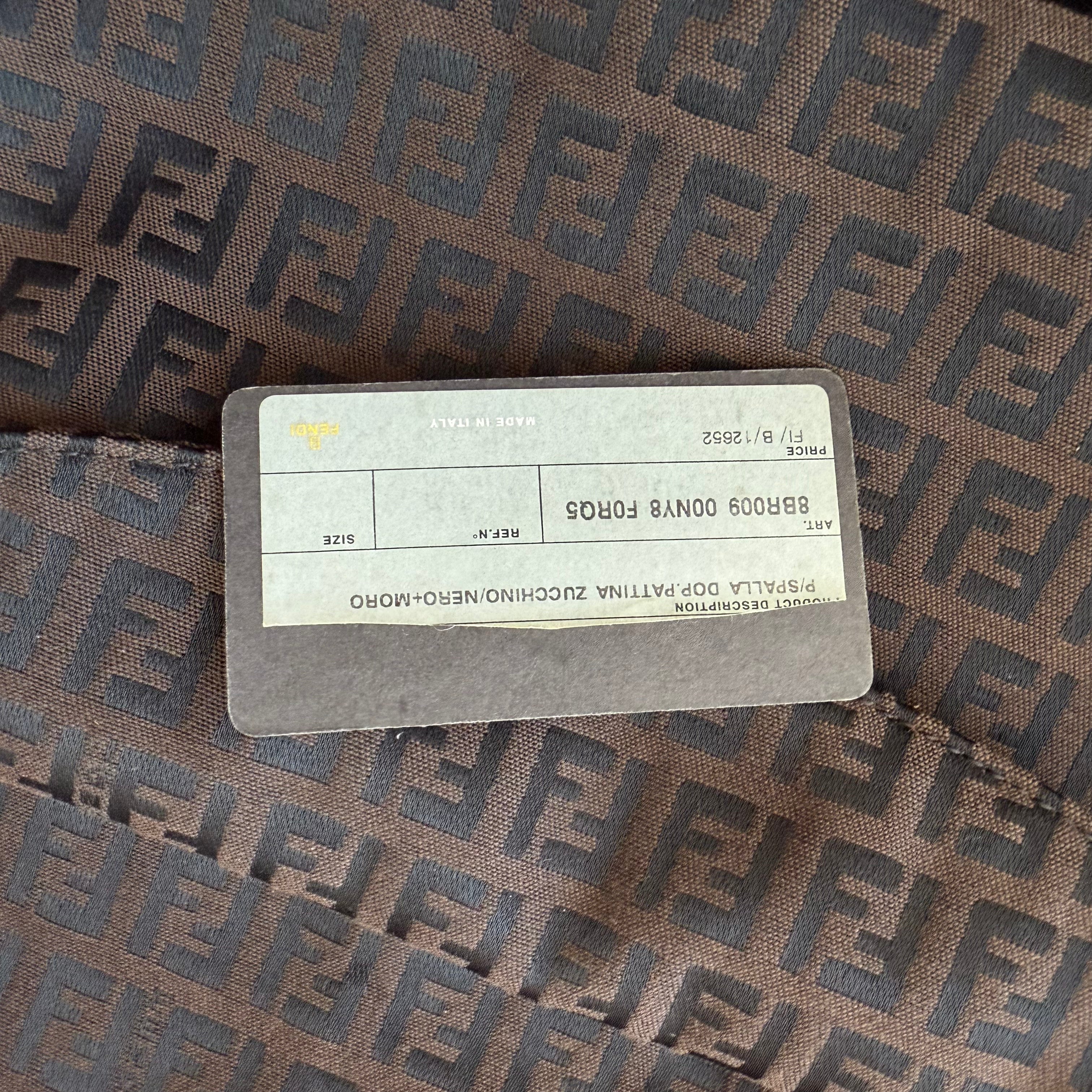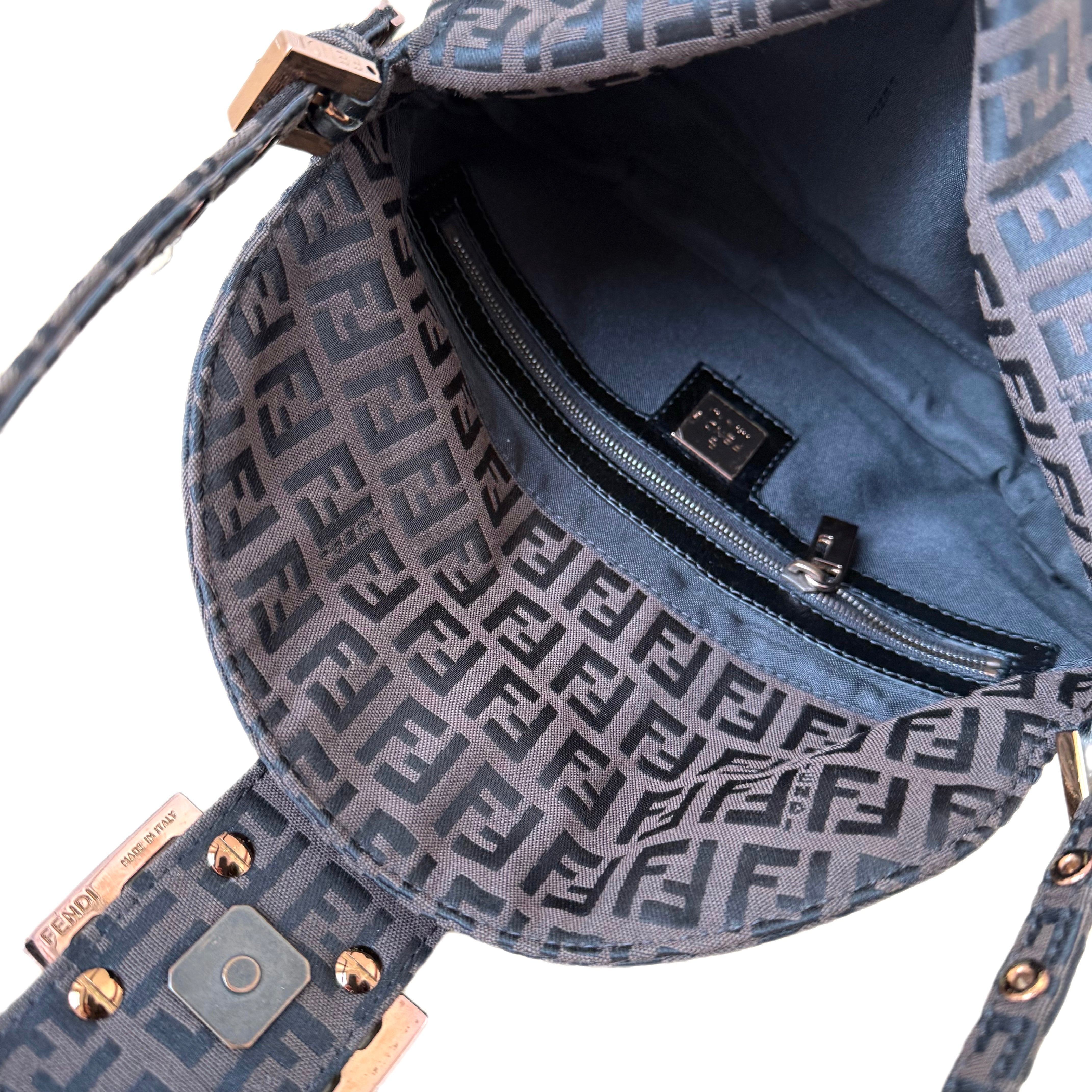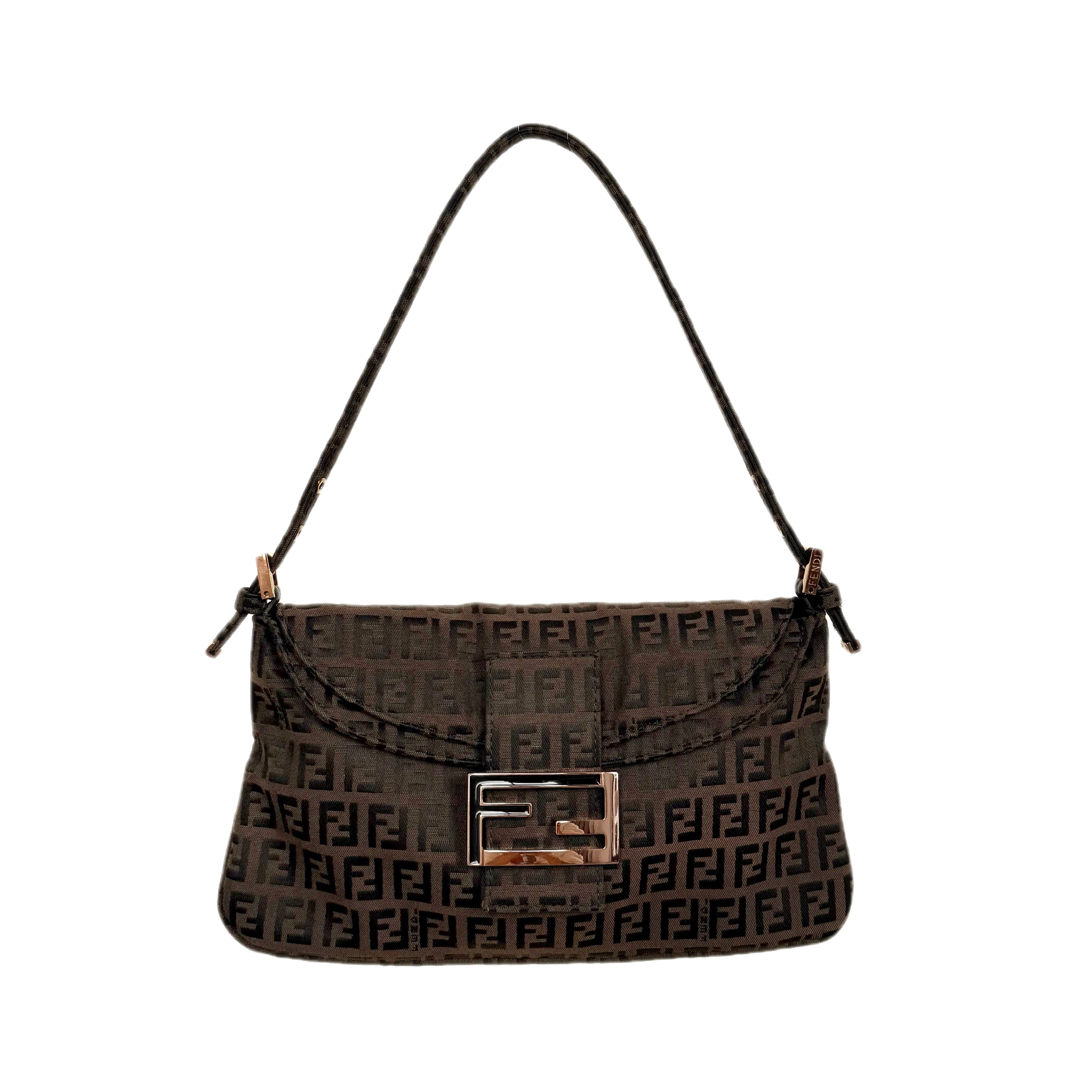 Fendi Zucchino canvas baguette shoulder bag in brown and black. Classic monogram design in an iconic silhouette.