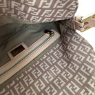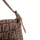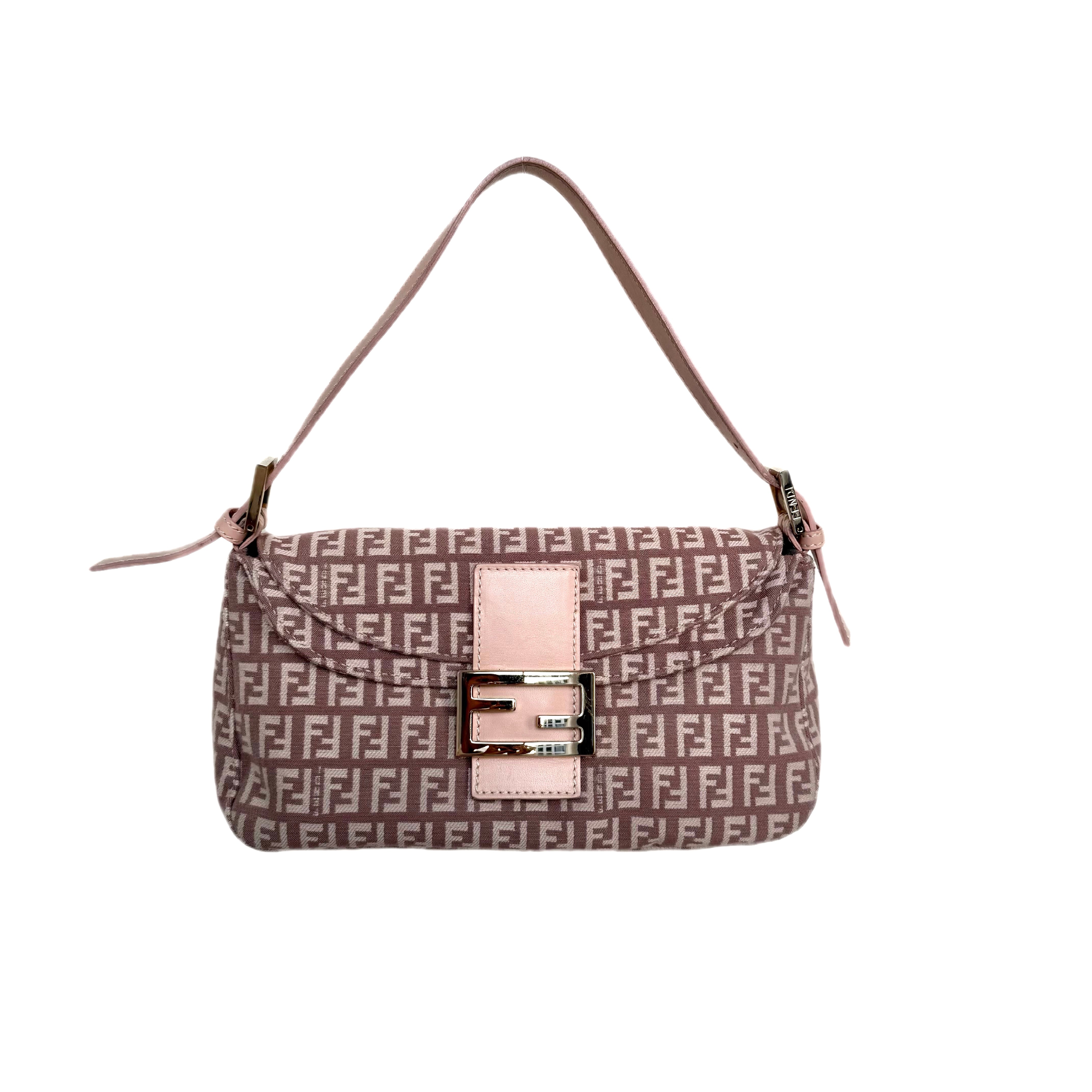 A classic Fendi Zucca Print Mini Mamma Baguette crafted in canvas with soft pink leather trim and signature FF buckle. Compact yet functional.