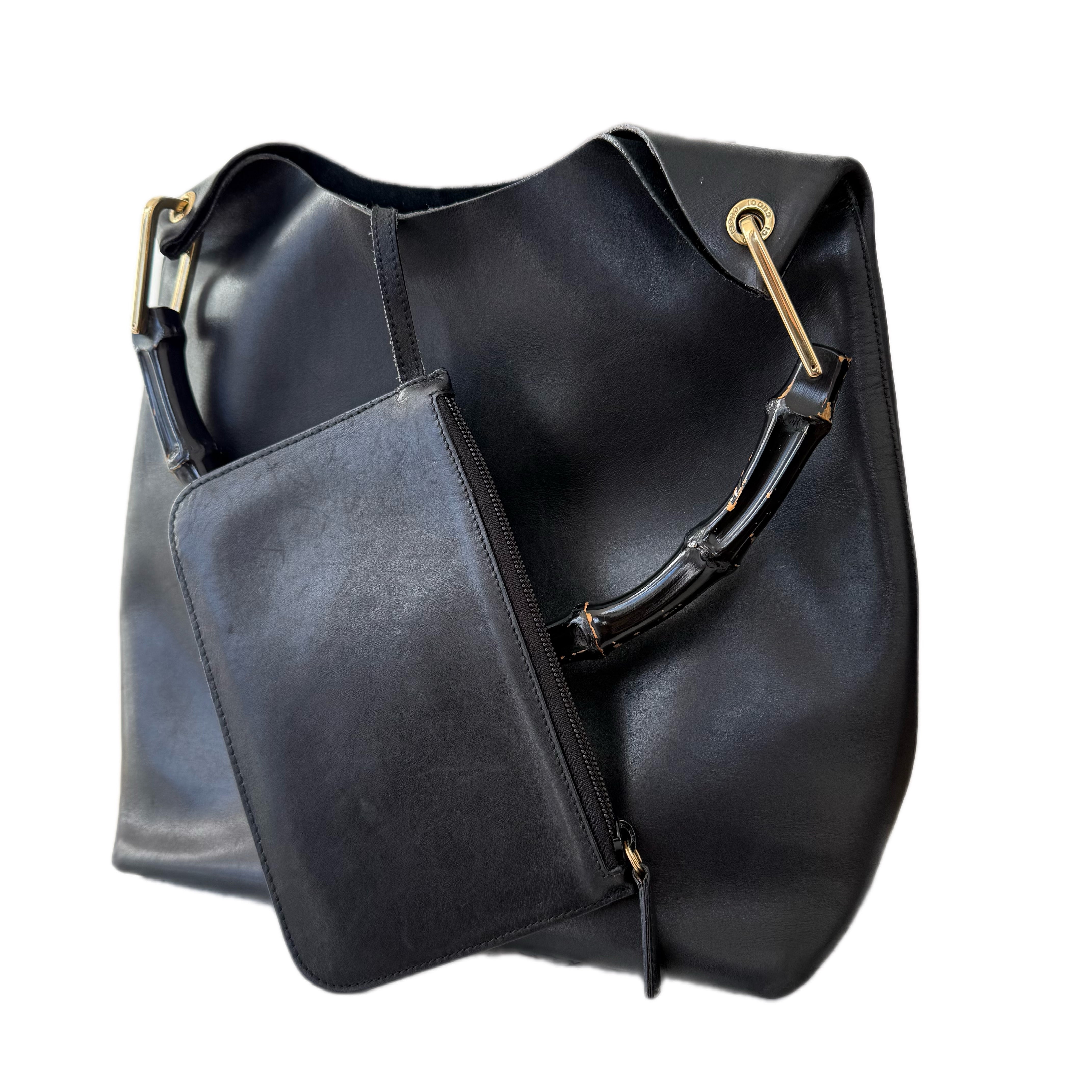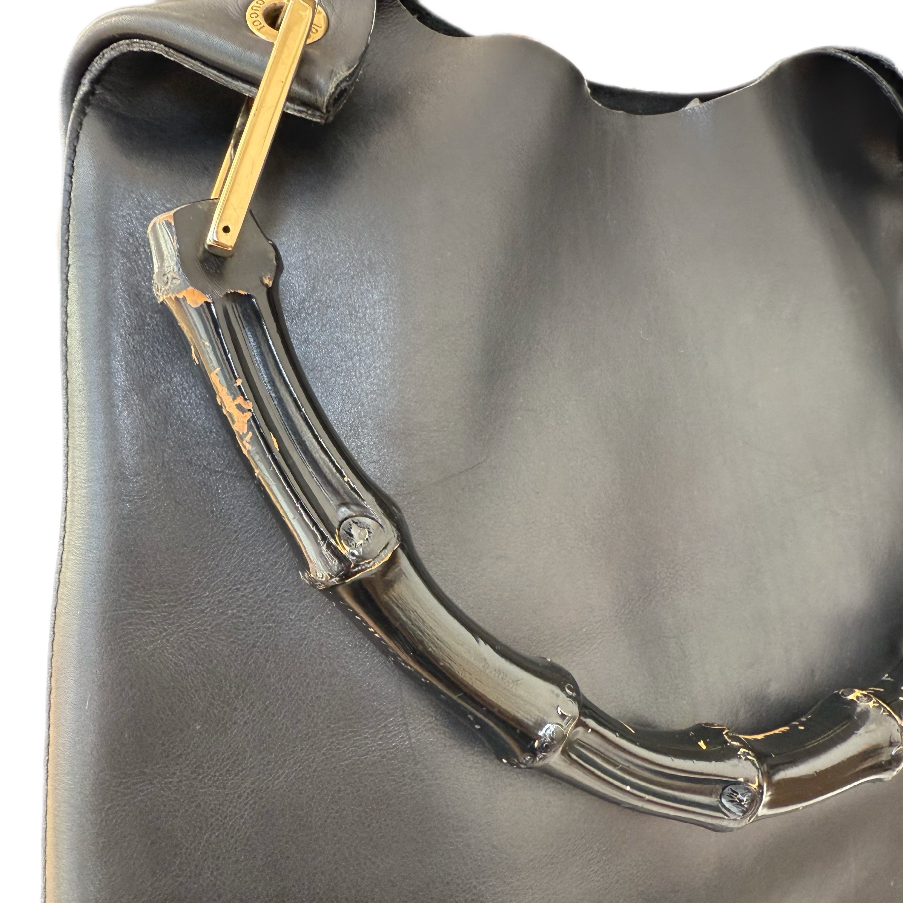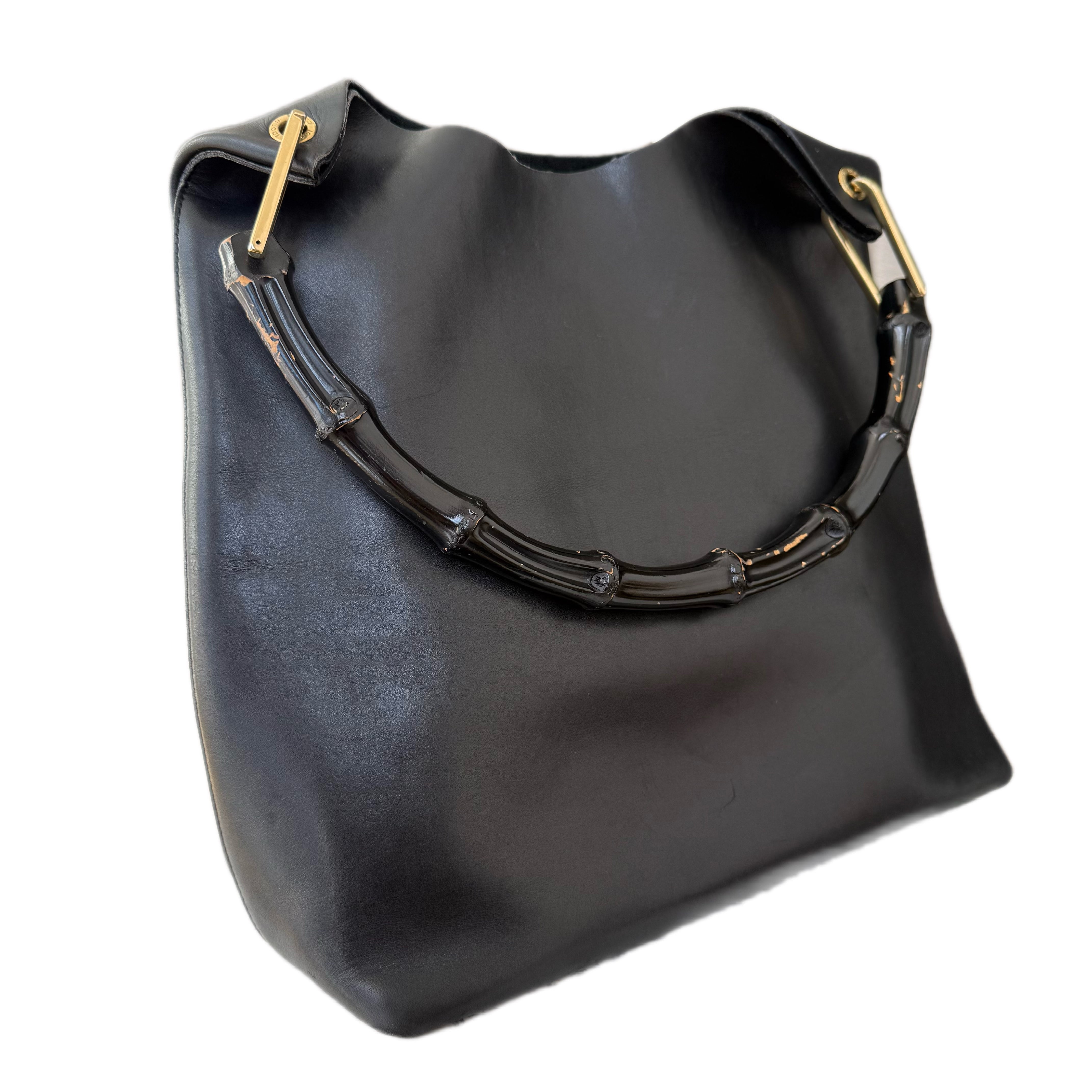 Gucci Black Leather Bamboo Handle Shoulder Hobo Tote Bag