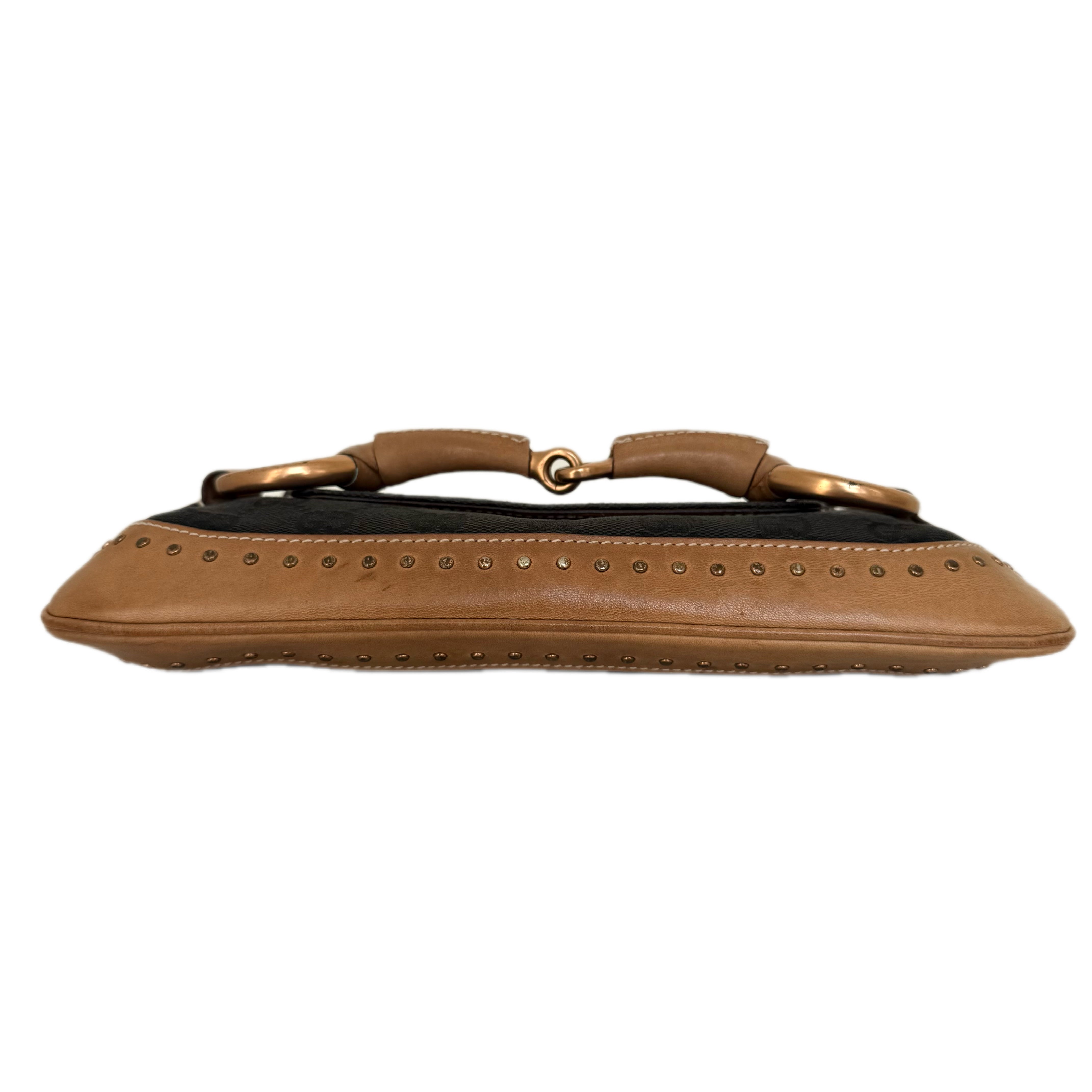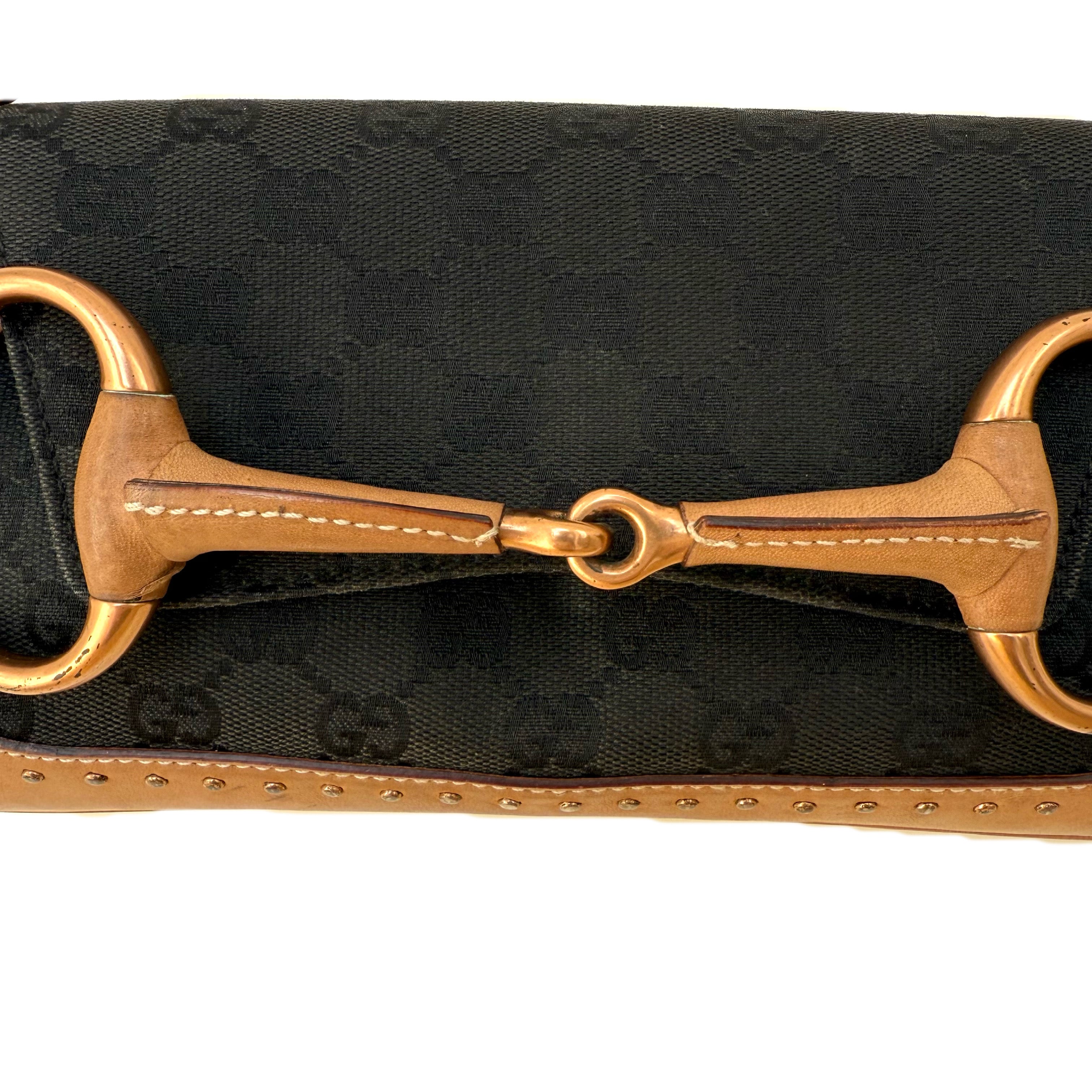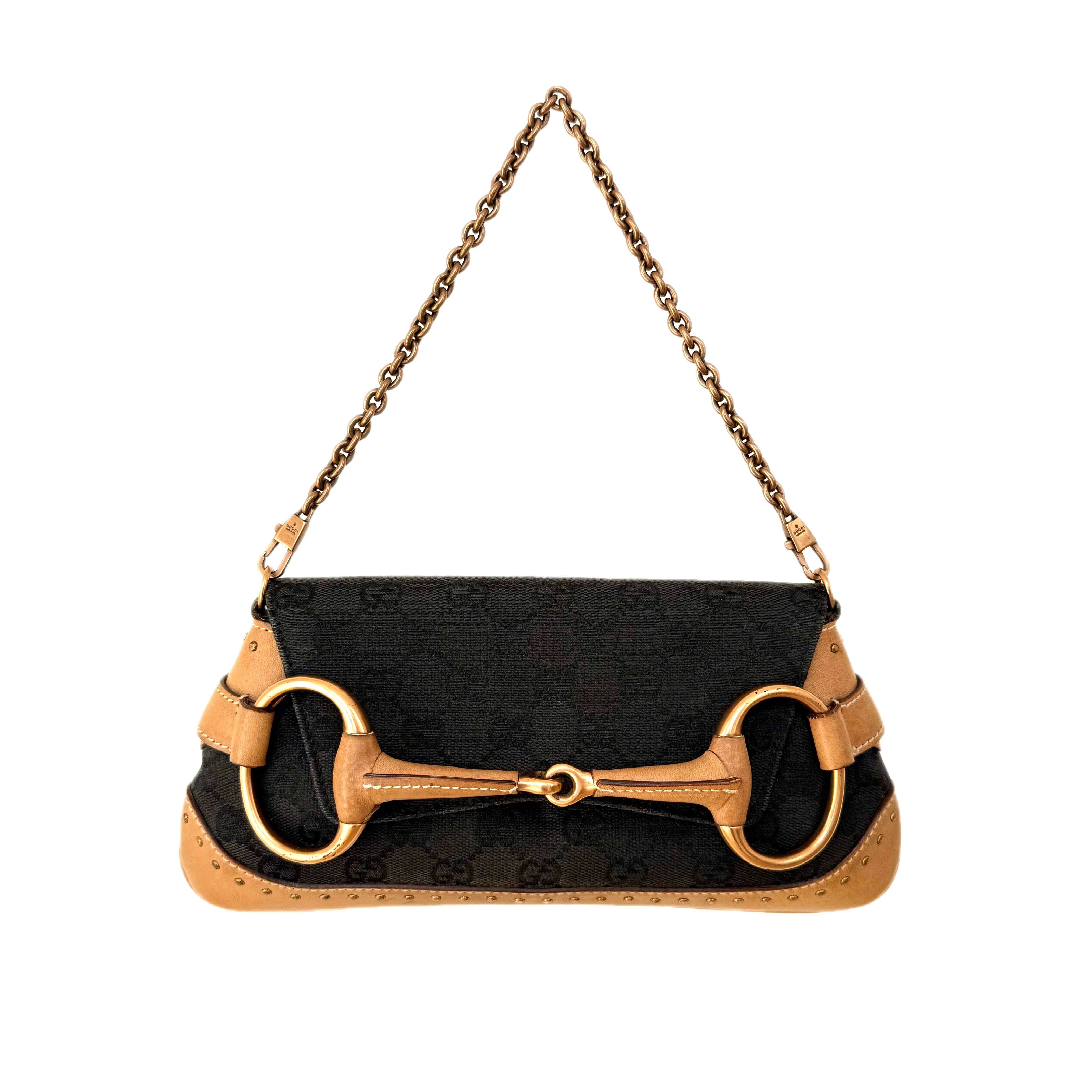 Gucci Tom Ford–Era Horsebit Chain Clutch in Black GG Canvas with Tan Leather Trim