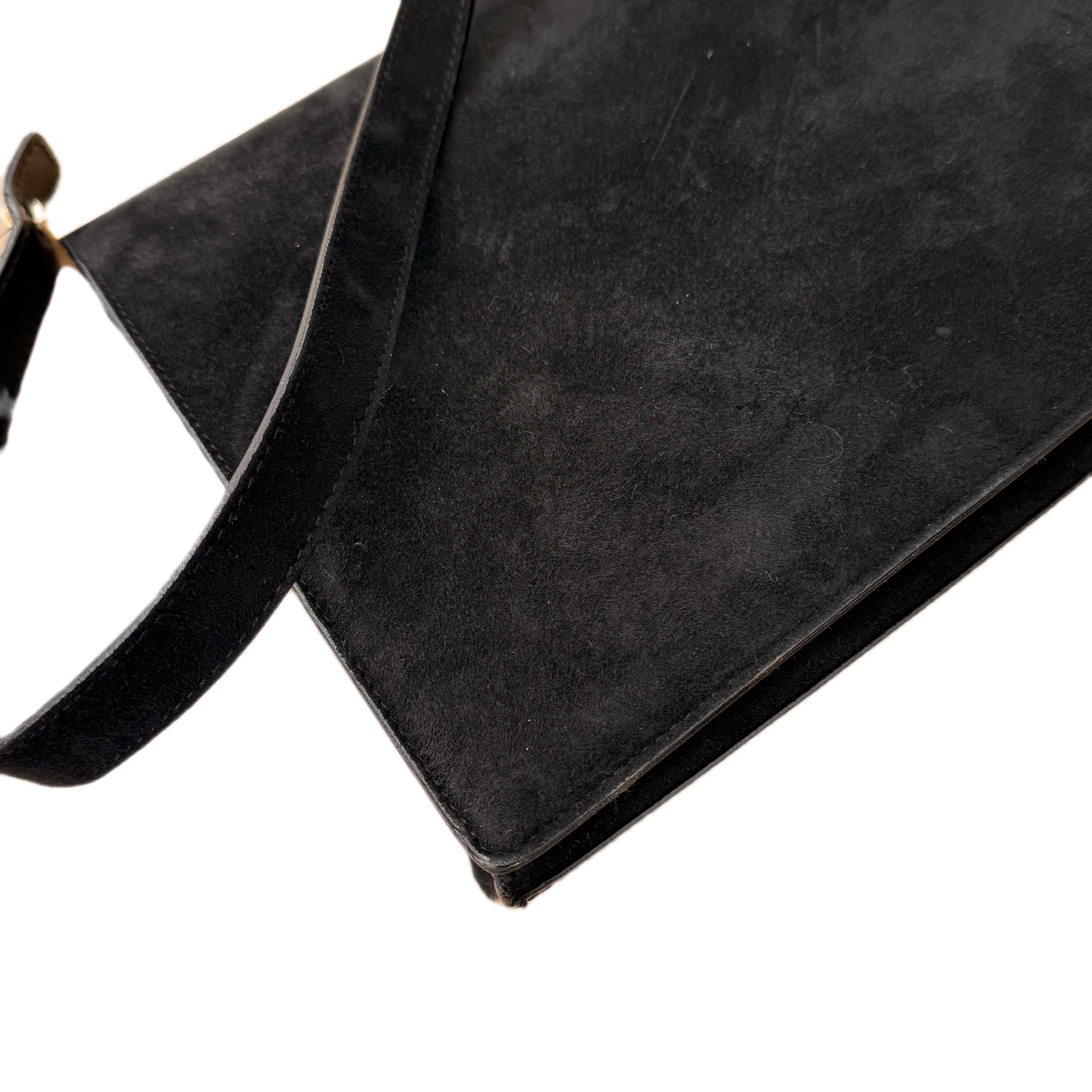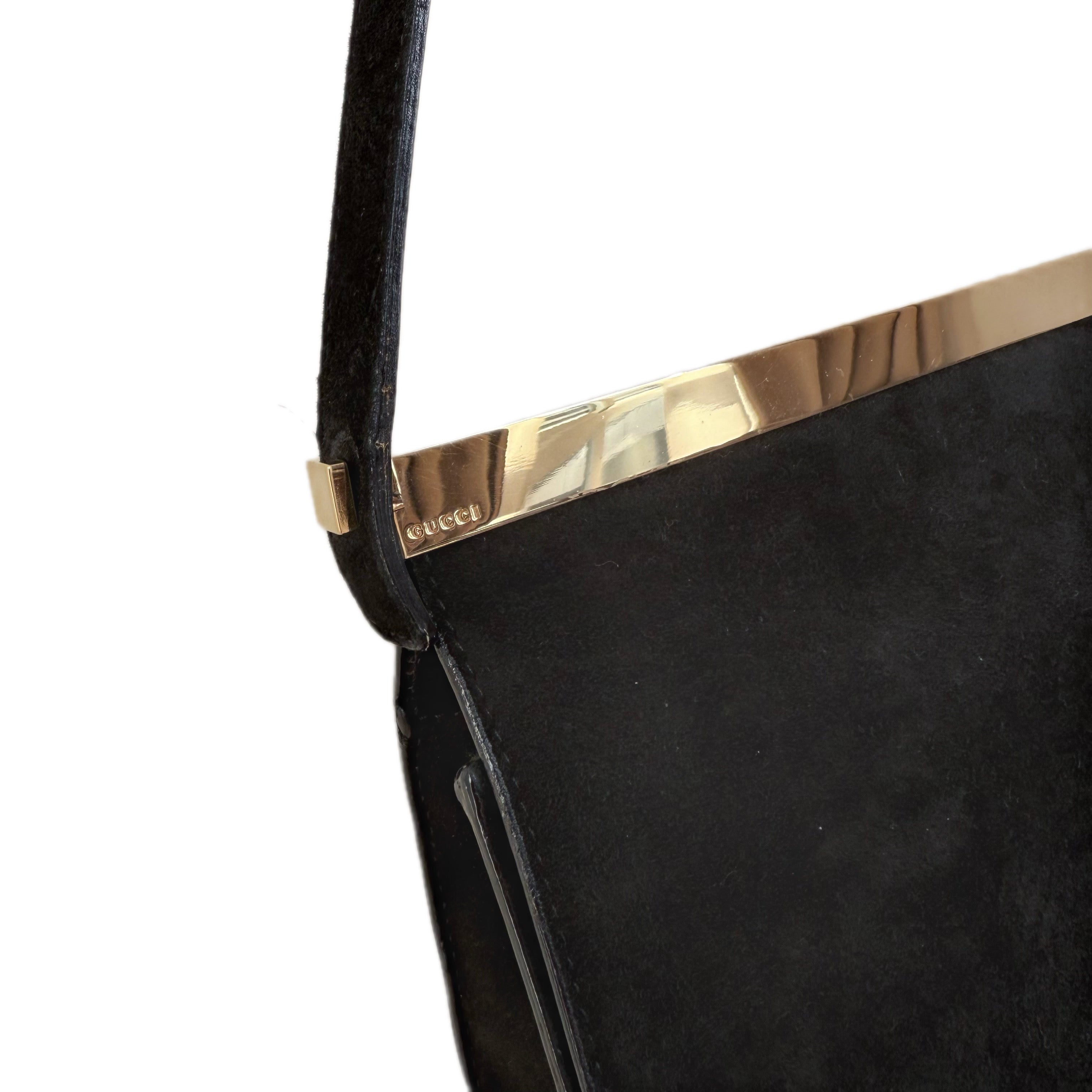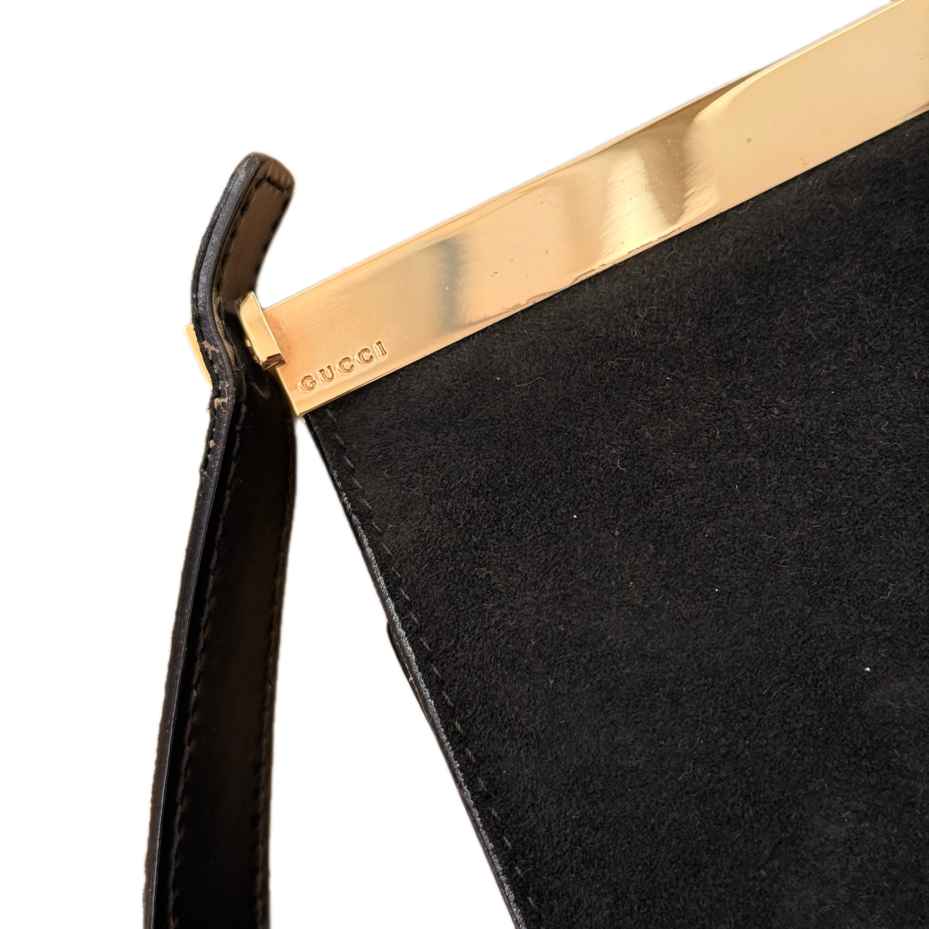 Vintage Gucci black suede bag with gold-tone frame hardware. Timeless elegant silhouette with refined craftsmanship.