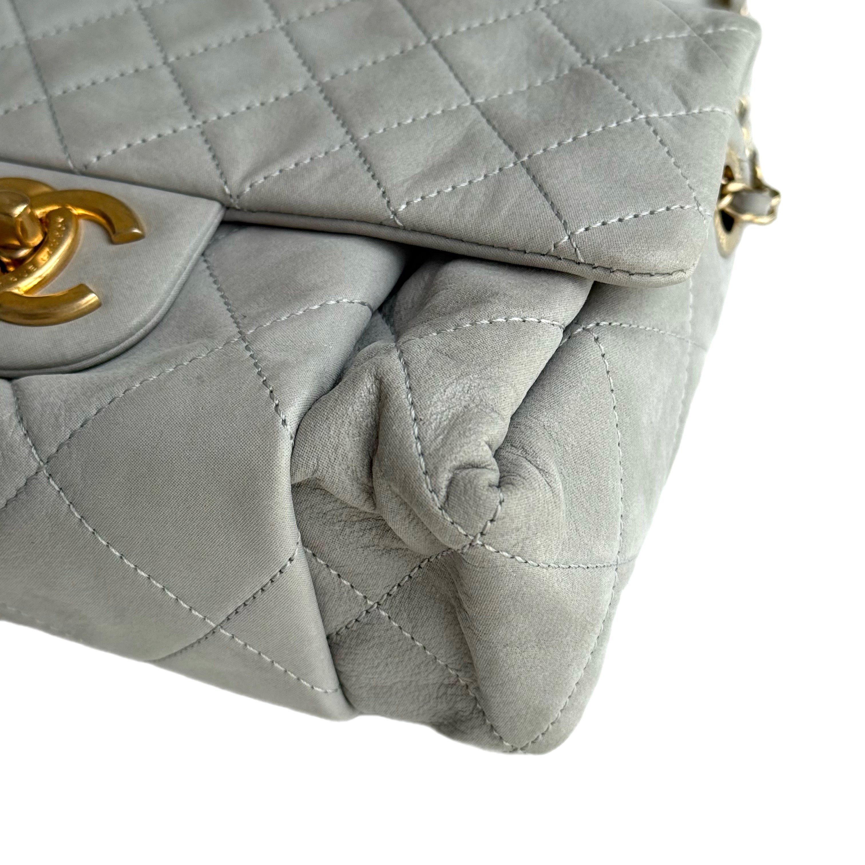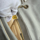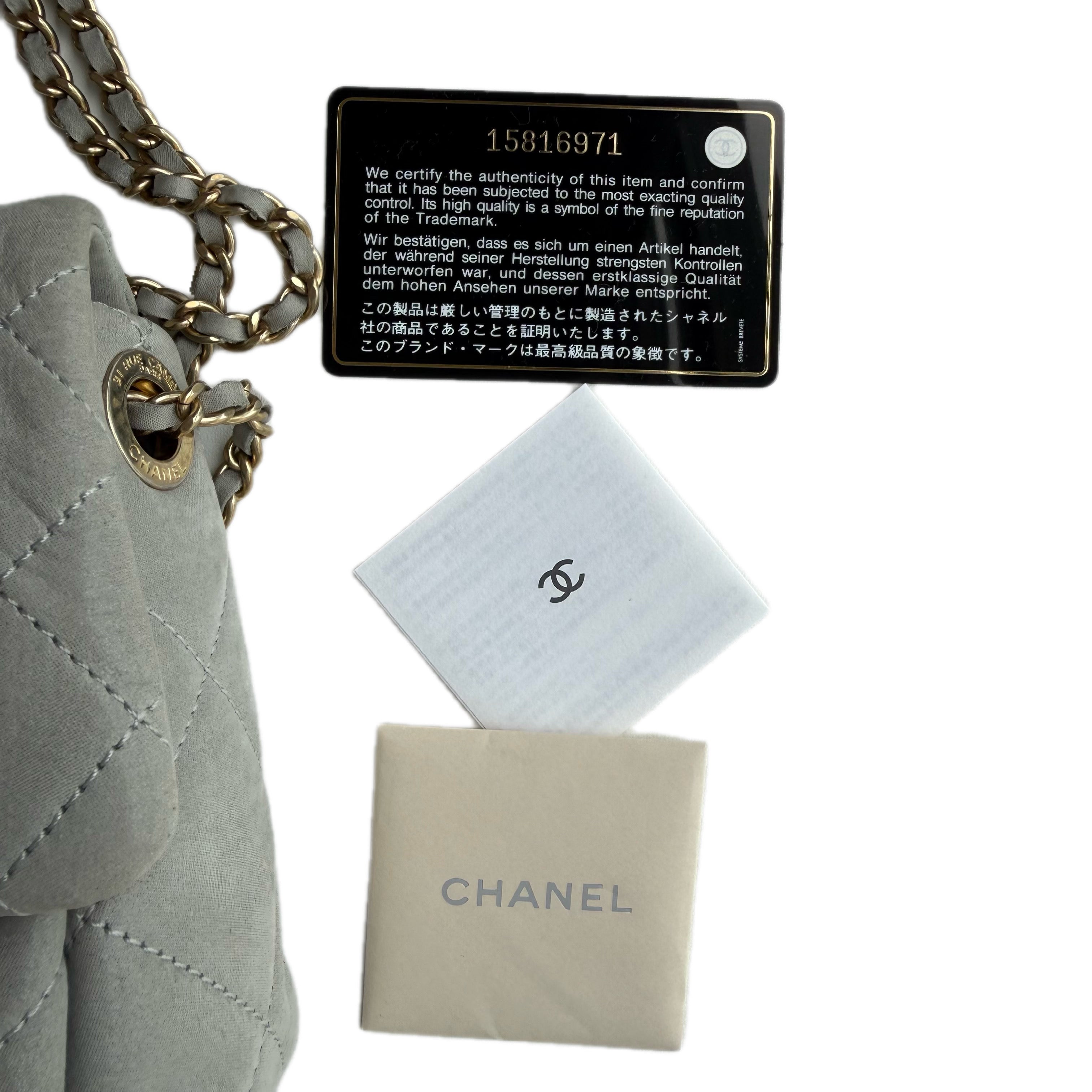 ヴィンテージ シャネル CC キルティング フラップ ショルダーバッグ(グレー ラムスキンレザー製)。鑑定カード付き。