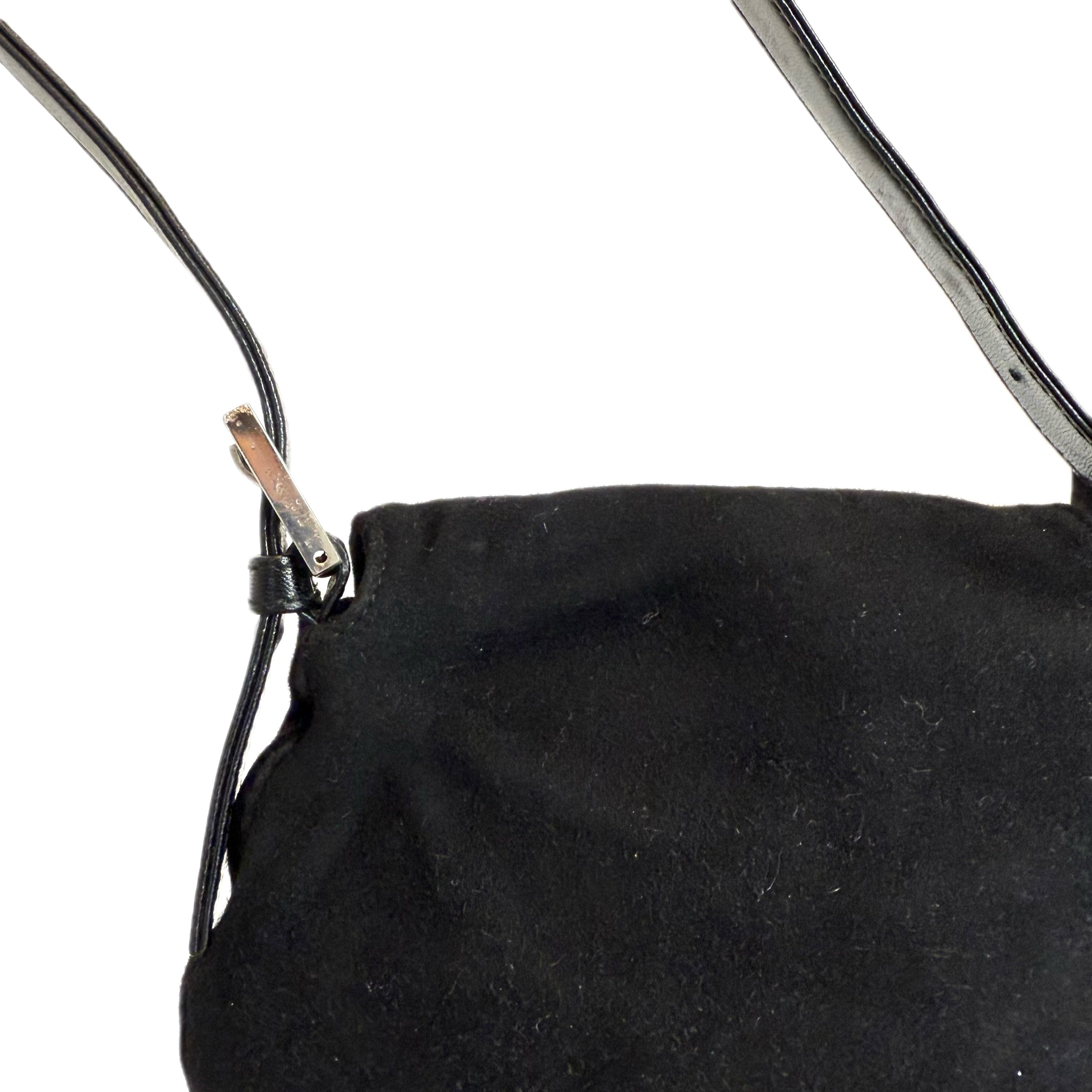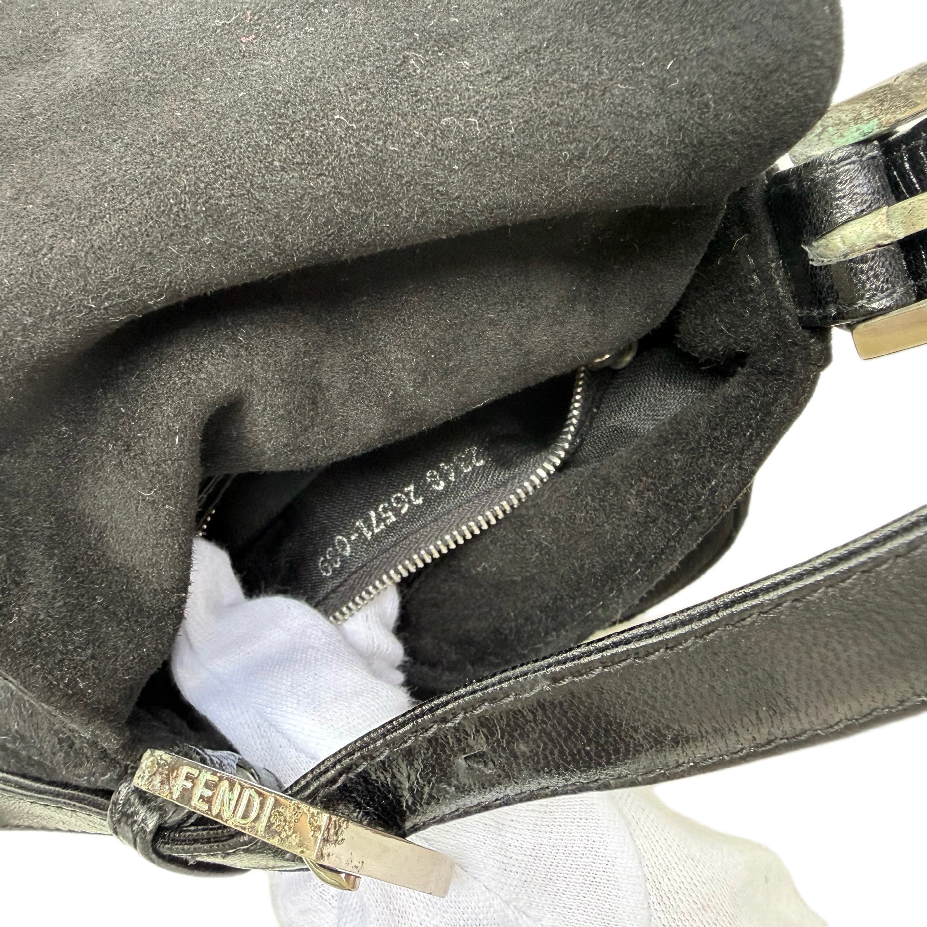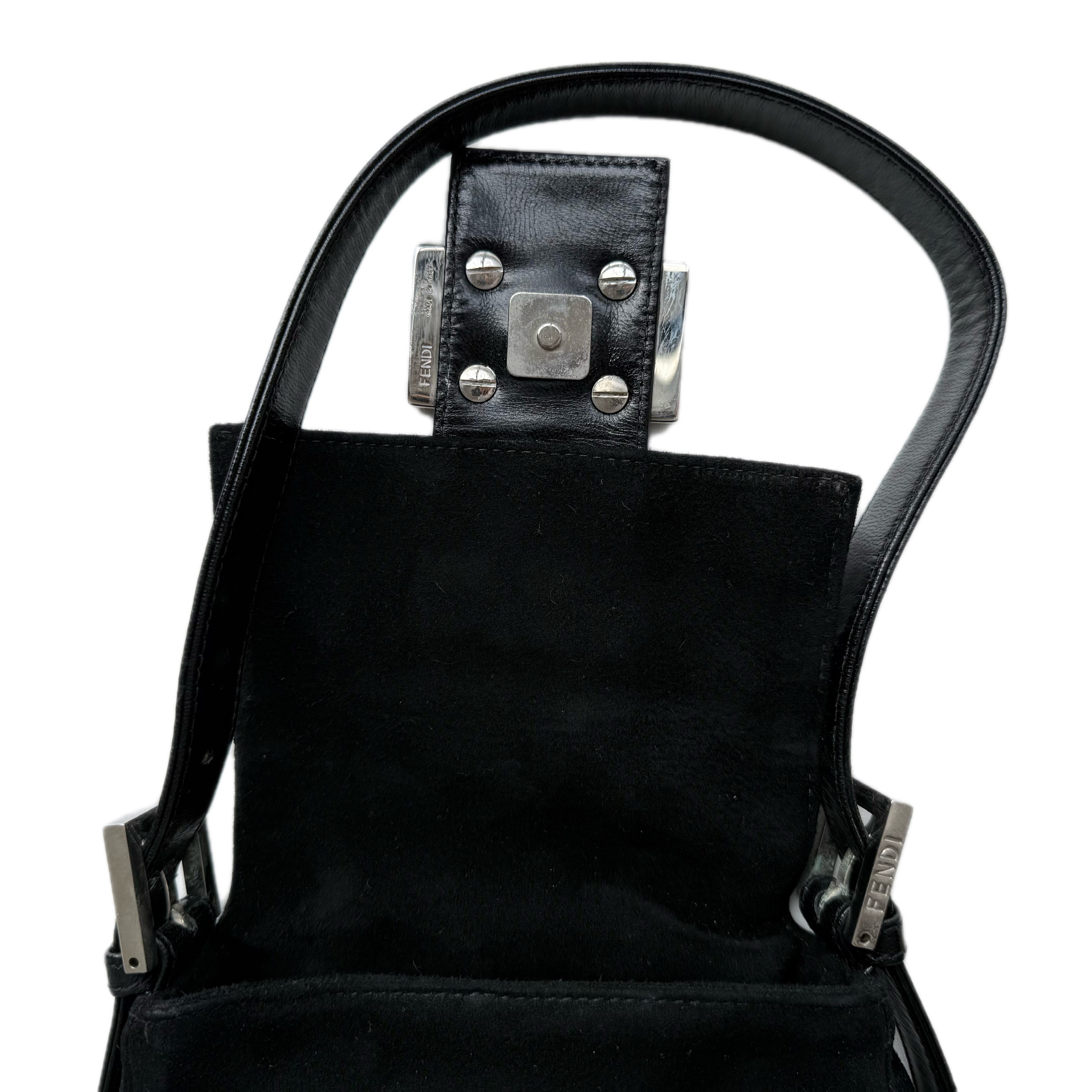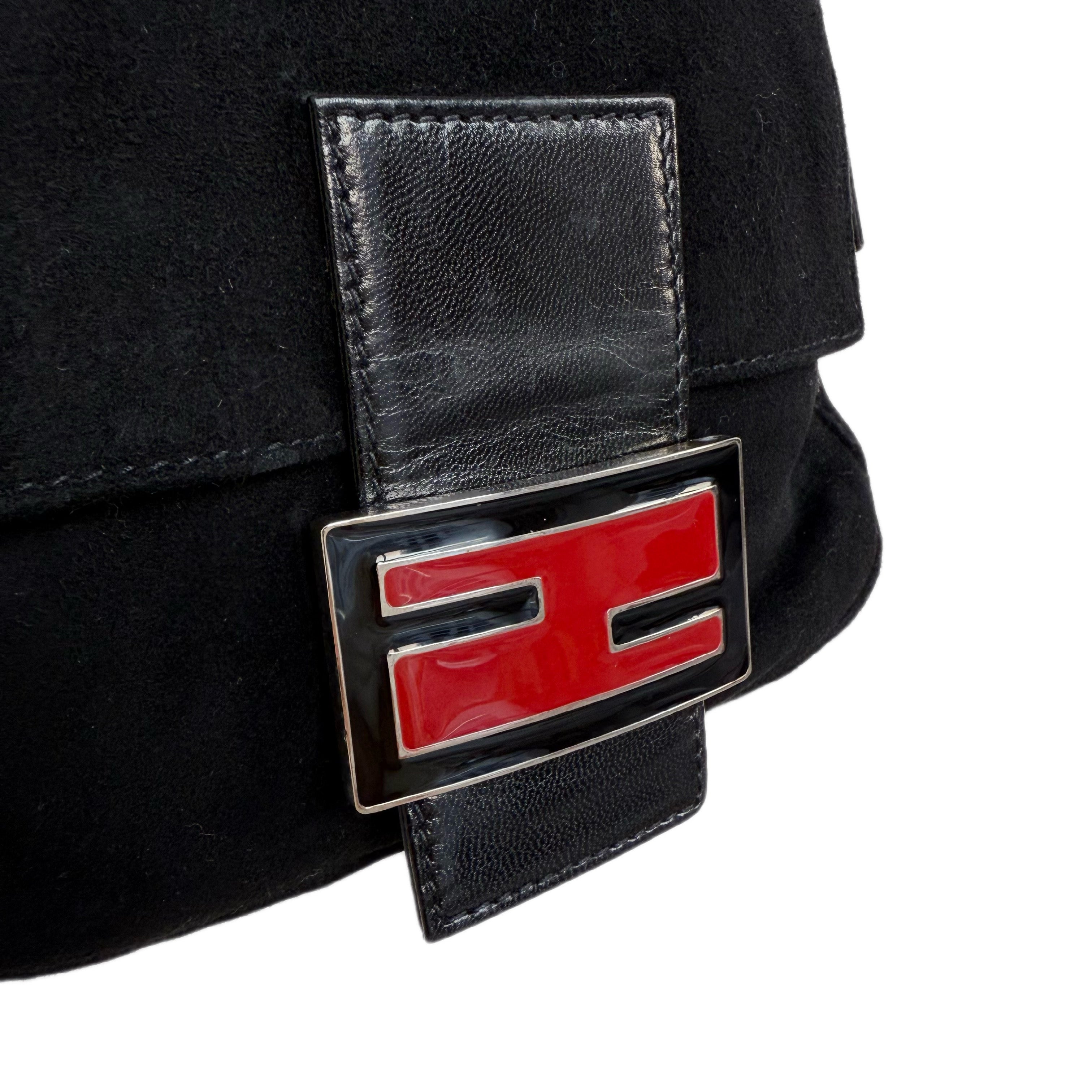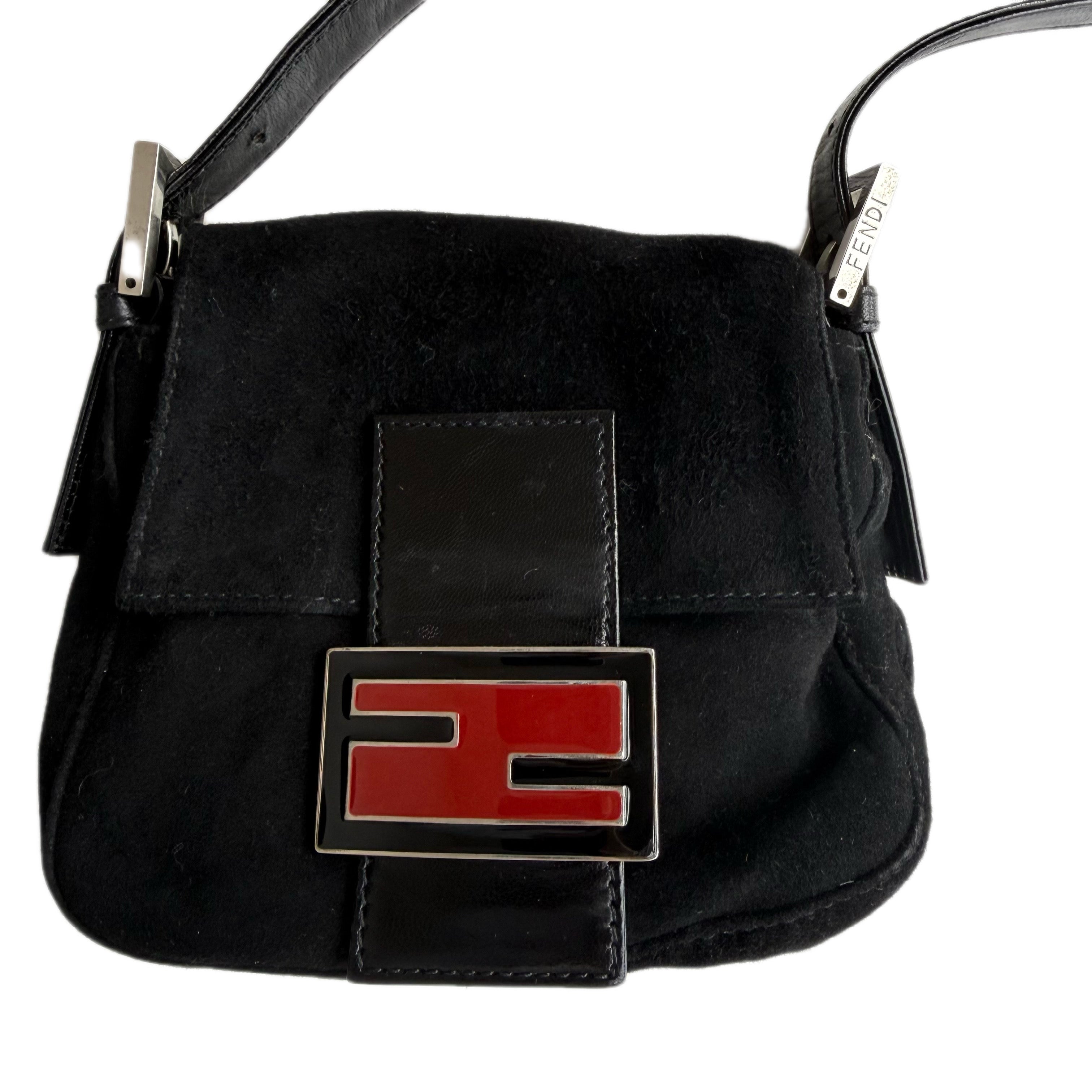 フェンディのミニバゲット。珍しい形とサイズのスエード素材を使用し、赤いシグネチャーFFバックルが特徴です。コンパクトながらも機能的です。品質は良好です(写真をご確認ください)。