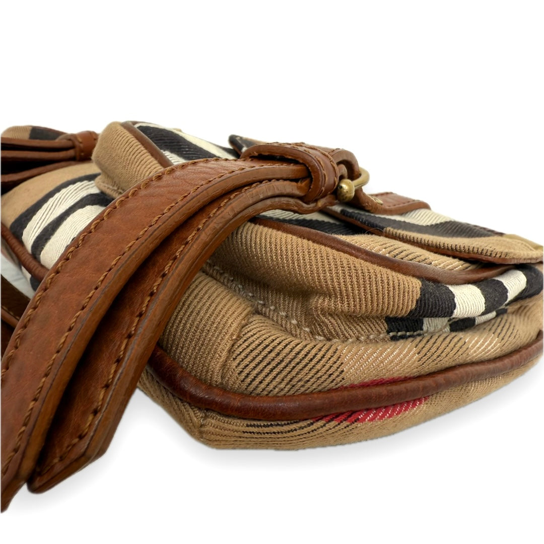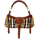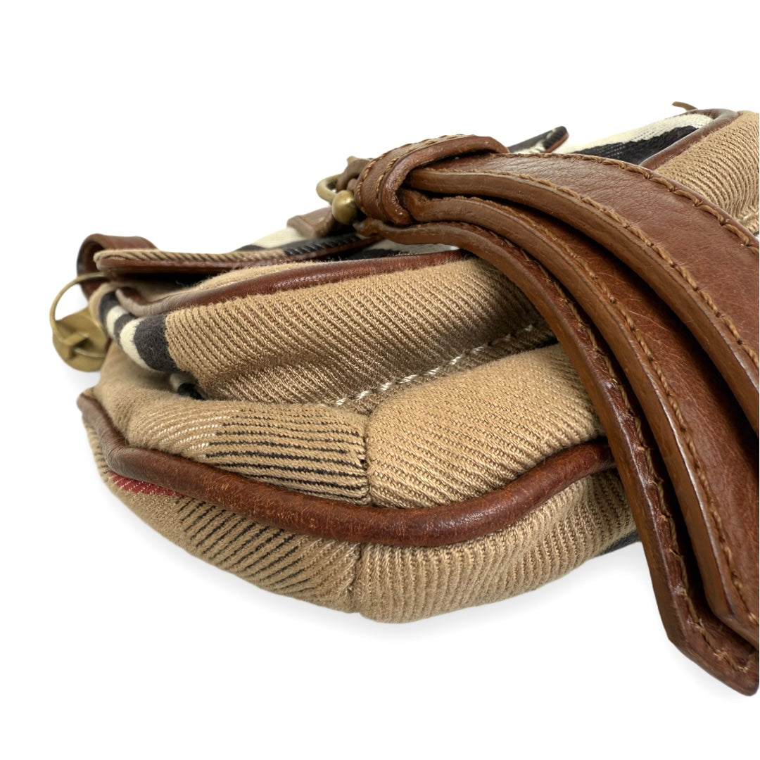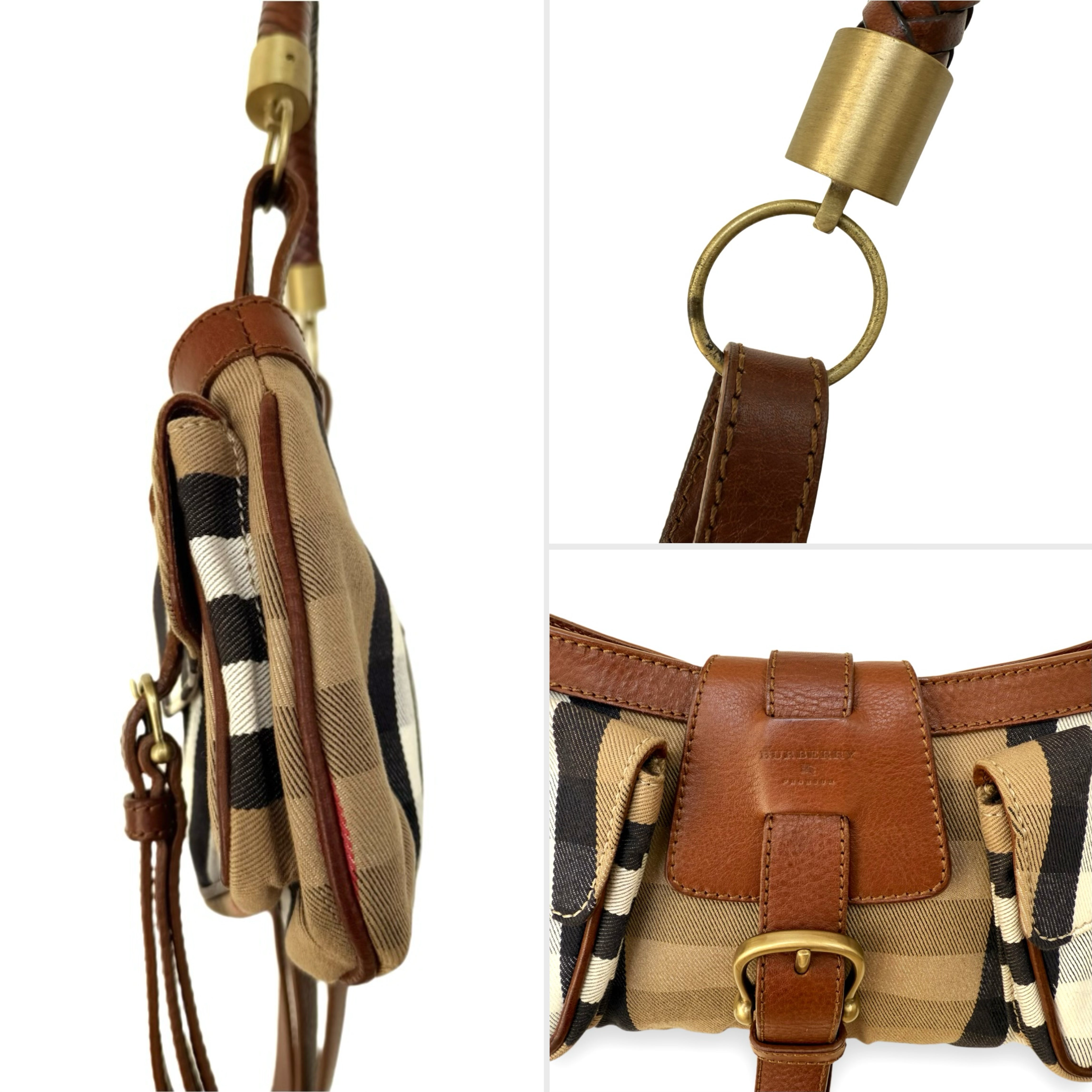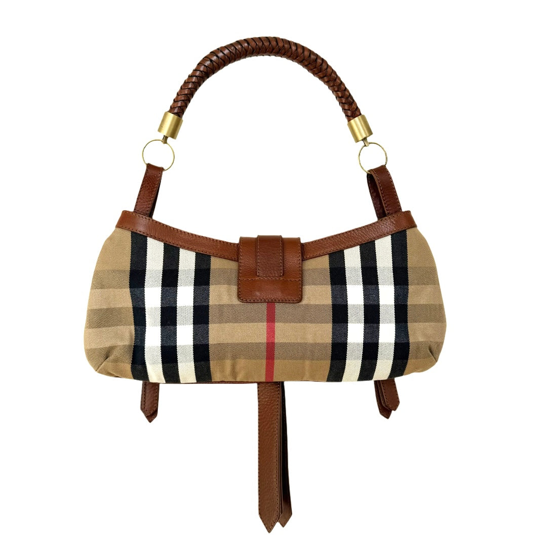 Burberry Prorsum House Check Cinda shoulder bag crafted in iconic check canvas with brown leather trim and a braided top handle. A classic, compact vintage piece with signature buckle details—perfect for everyday wear and collectors alike.