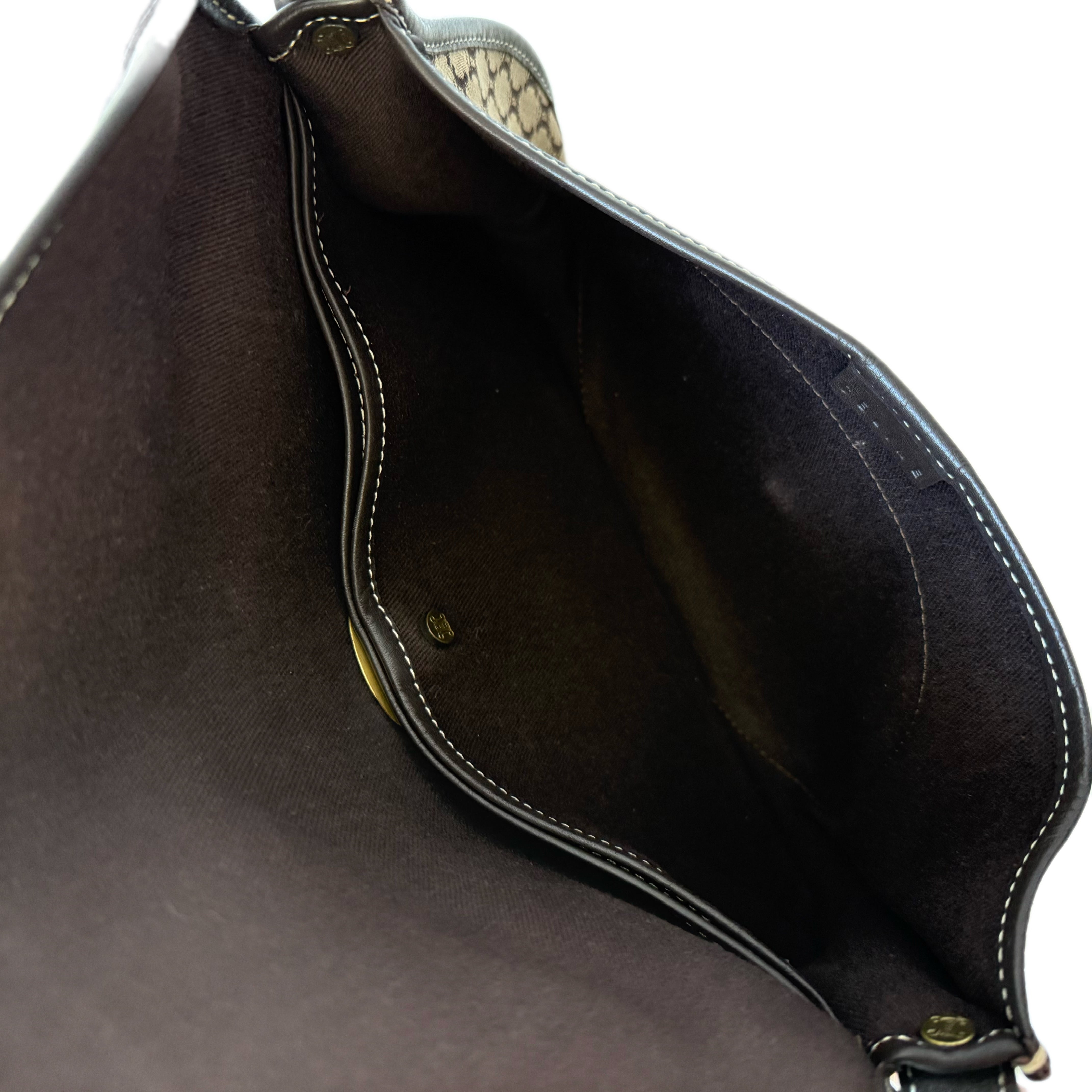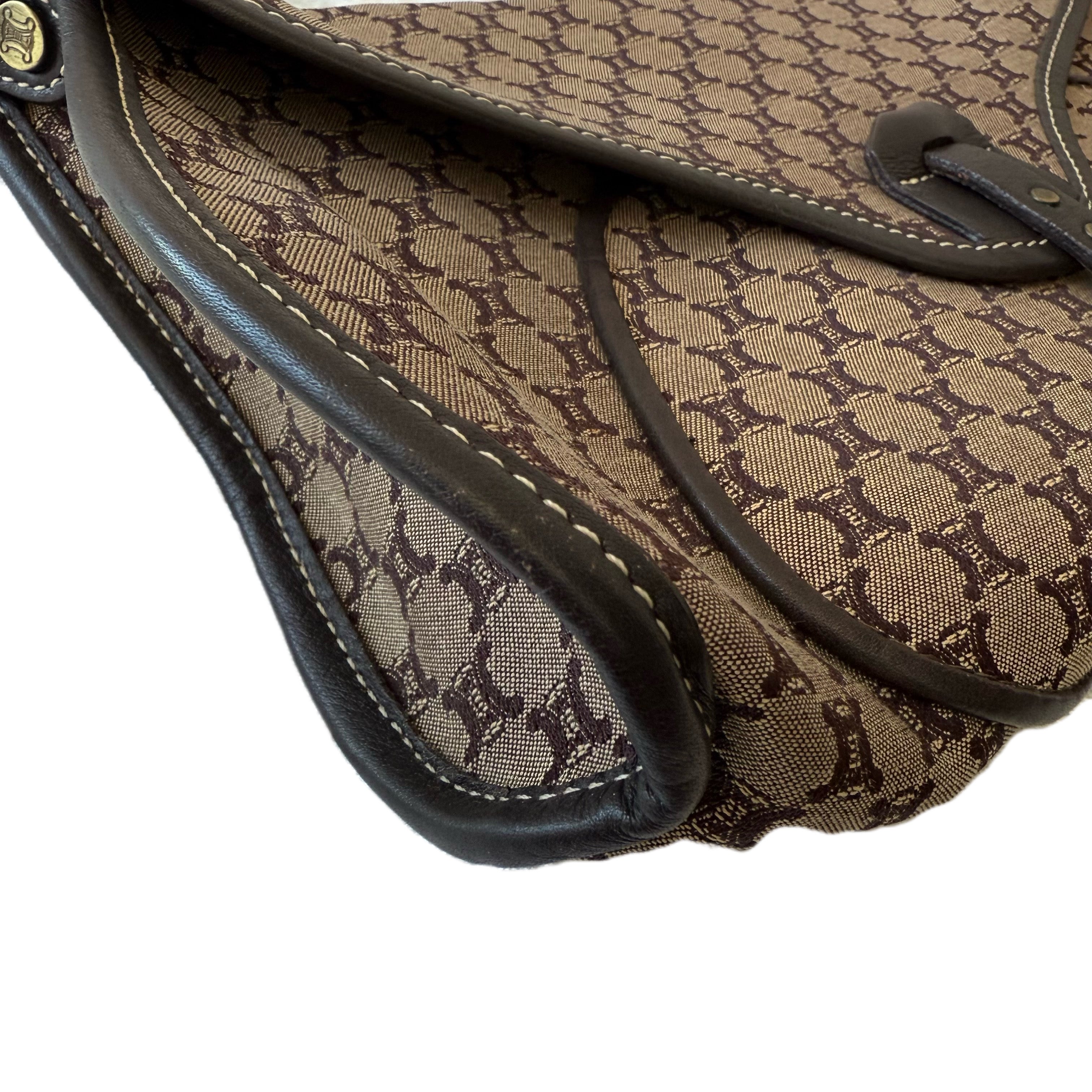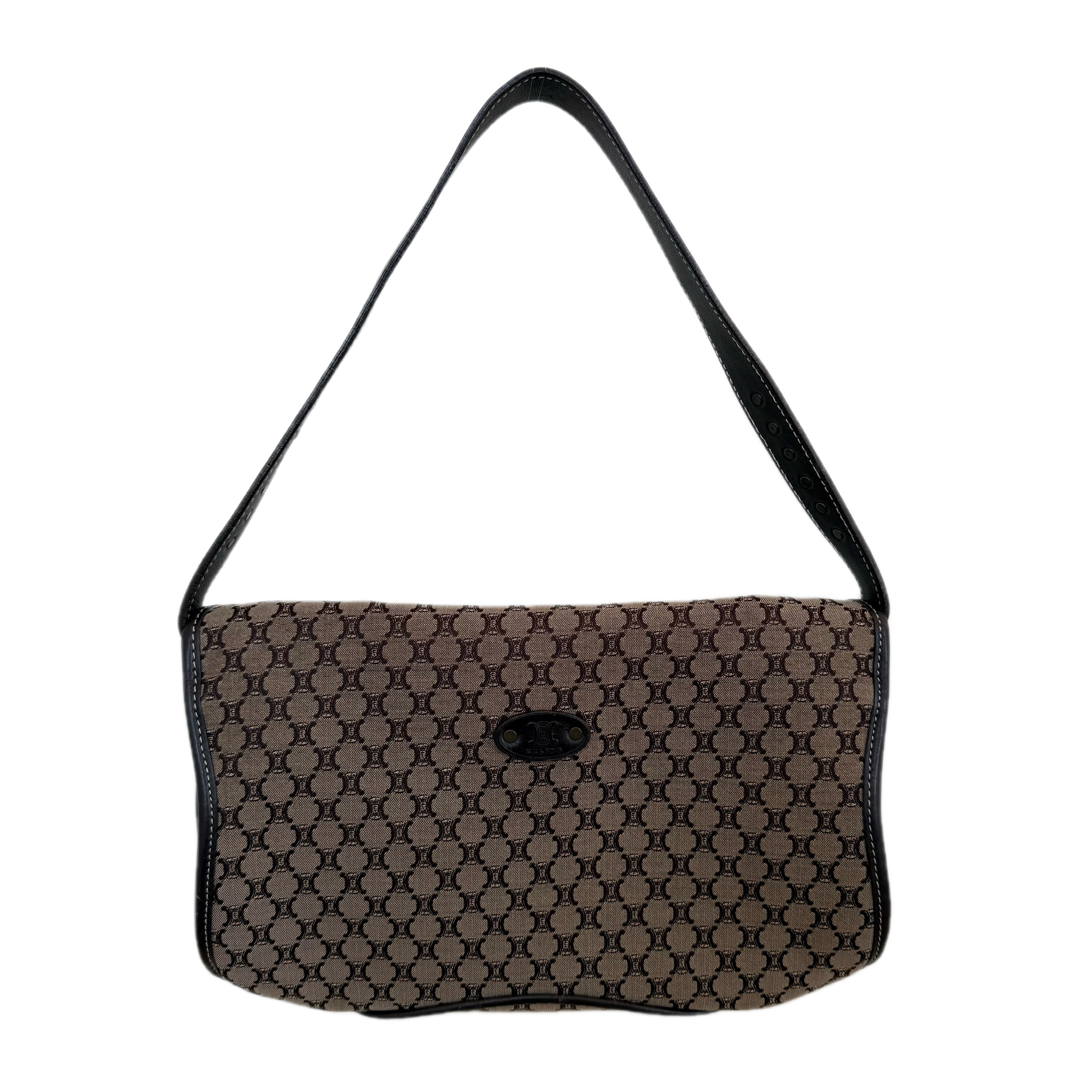 Céline Macadam canvas shoulder bag in brown with black leather trim. Classic monogram design in a timeless everyday silhouette.