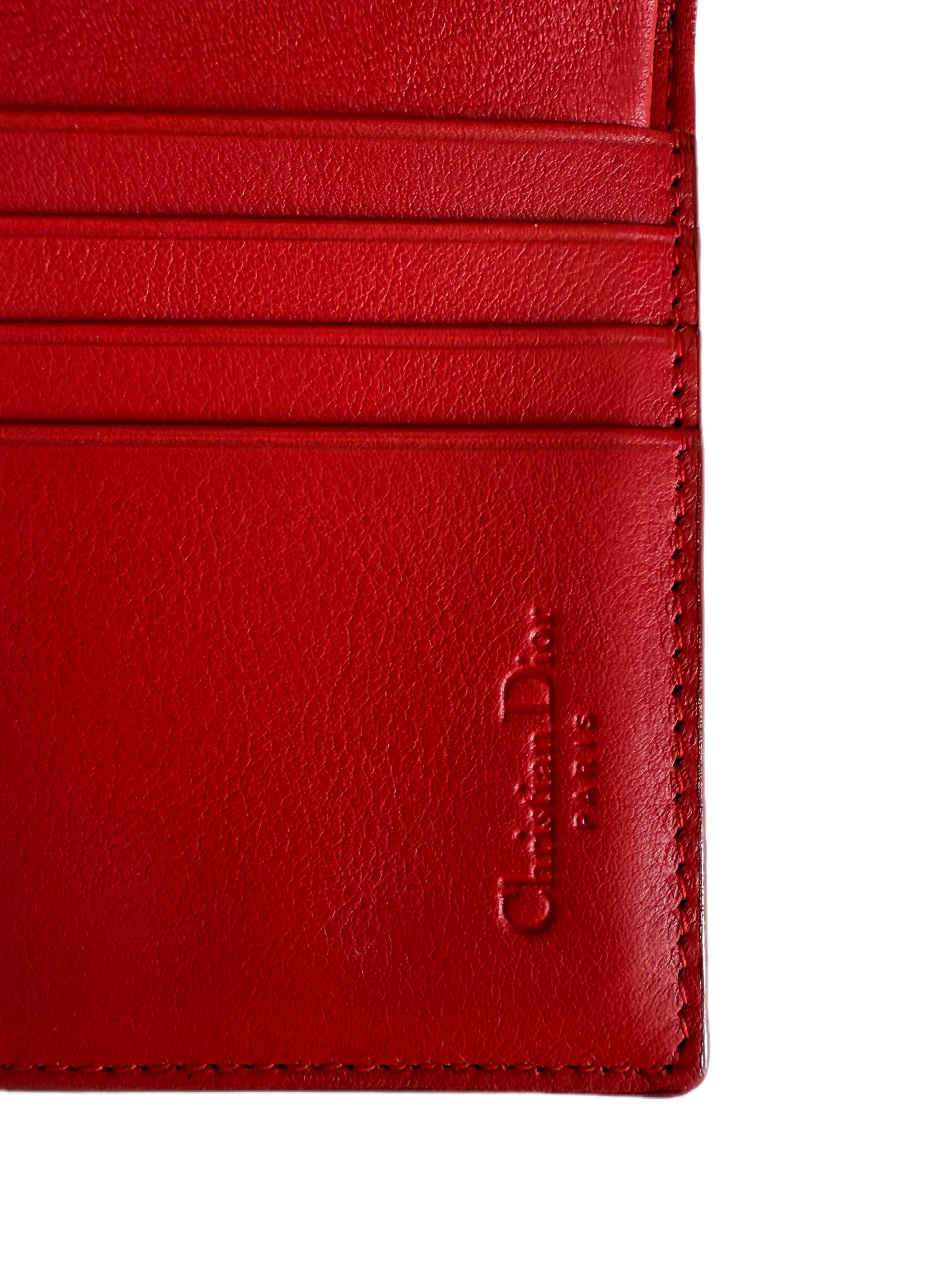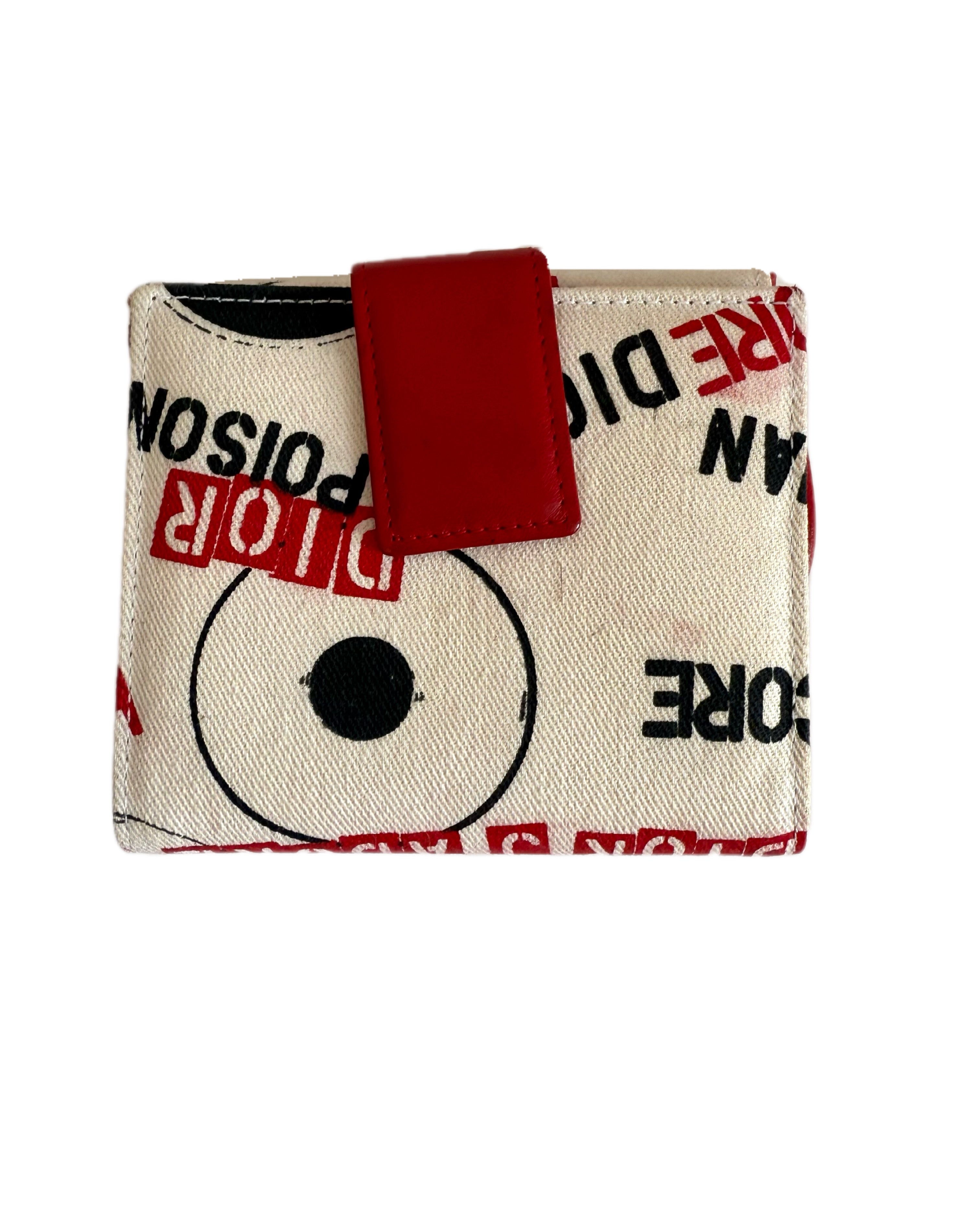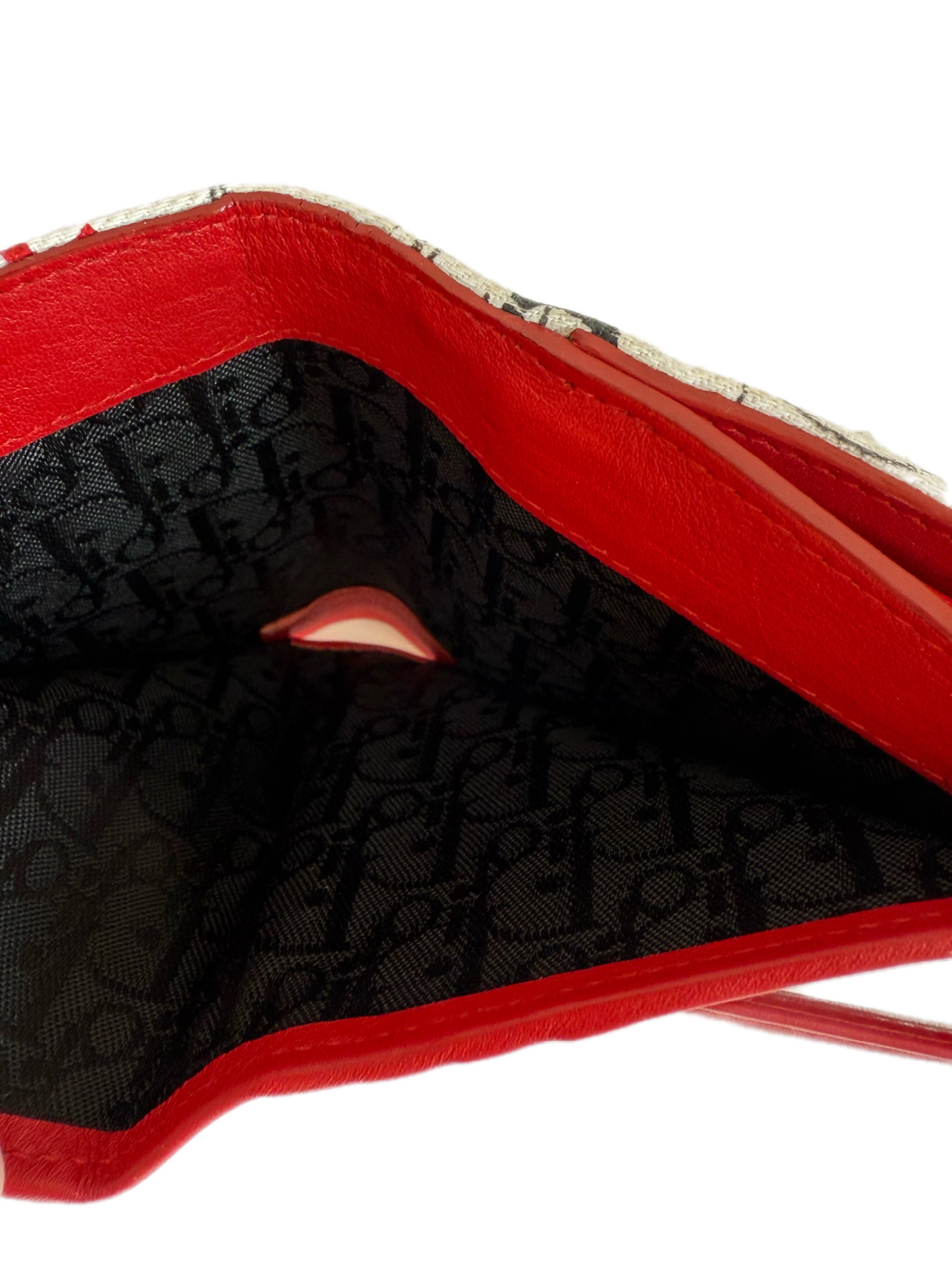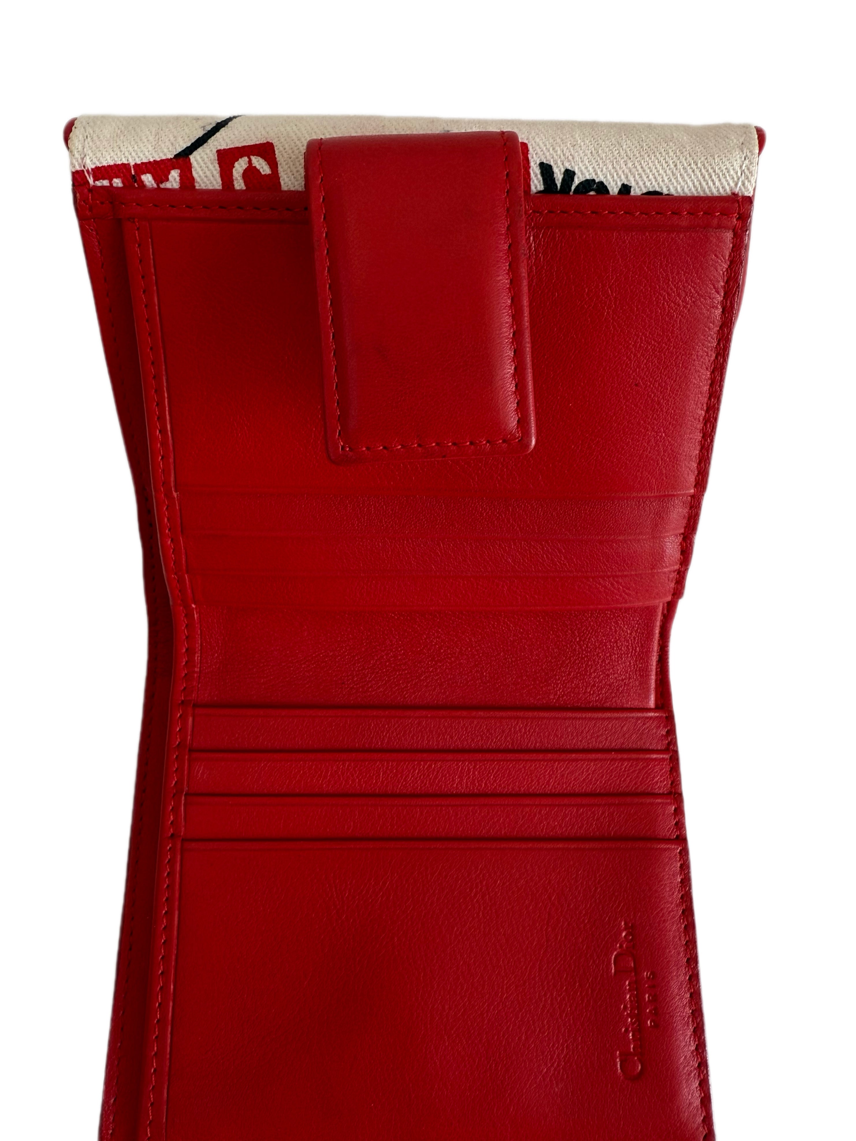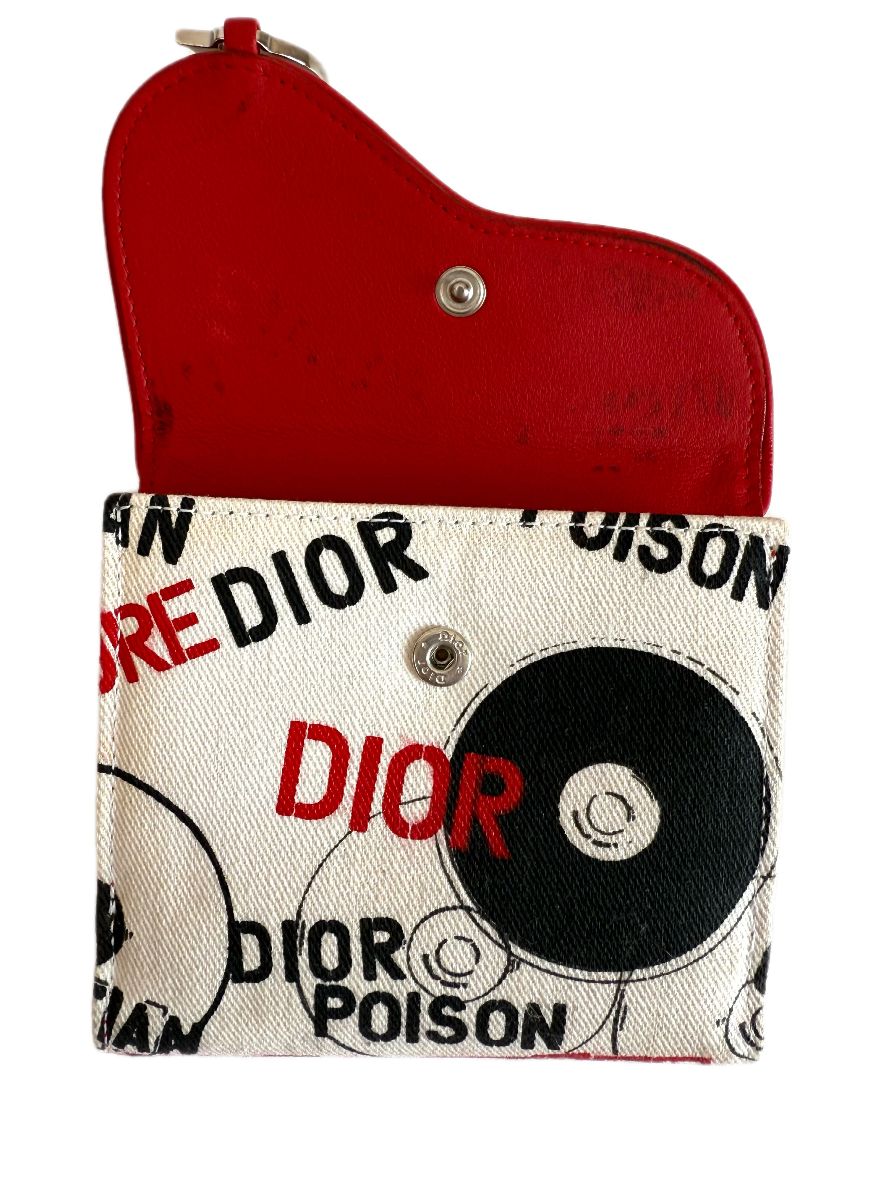 Christian Dior Galliano-era Hardcore / Poison bifold wallet in record print canvas with red leather piping. Rare archival piece highly sought after by collectors.