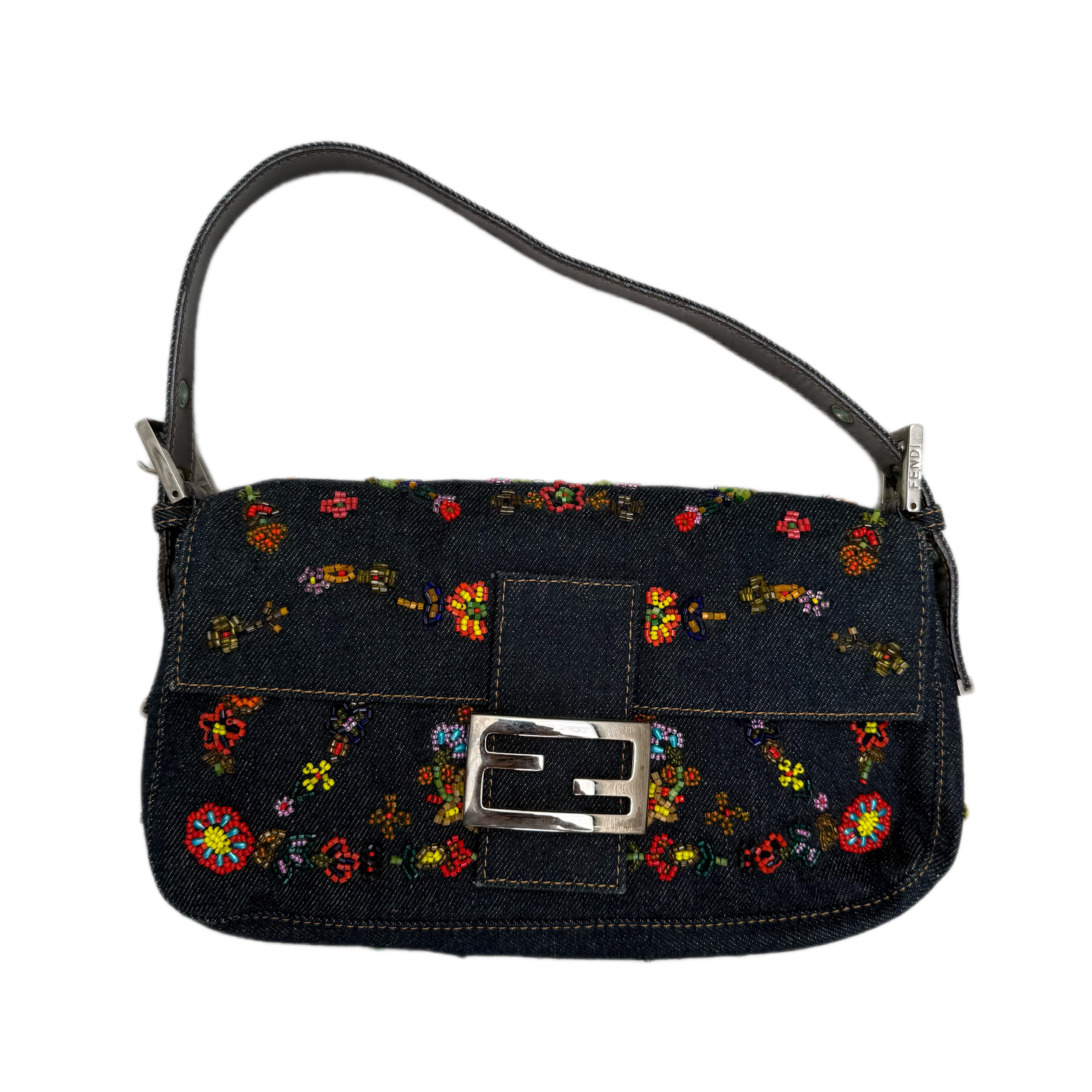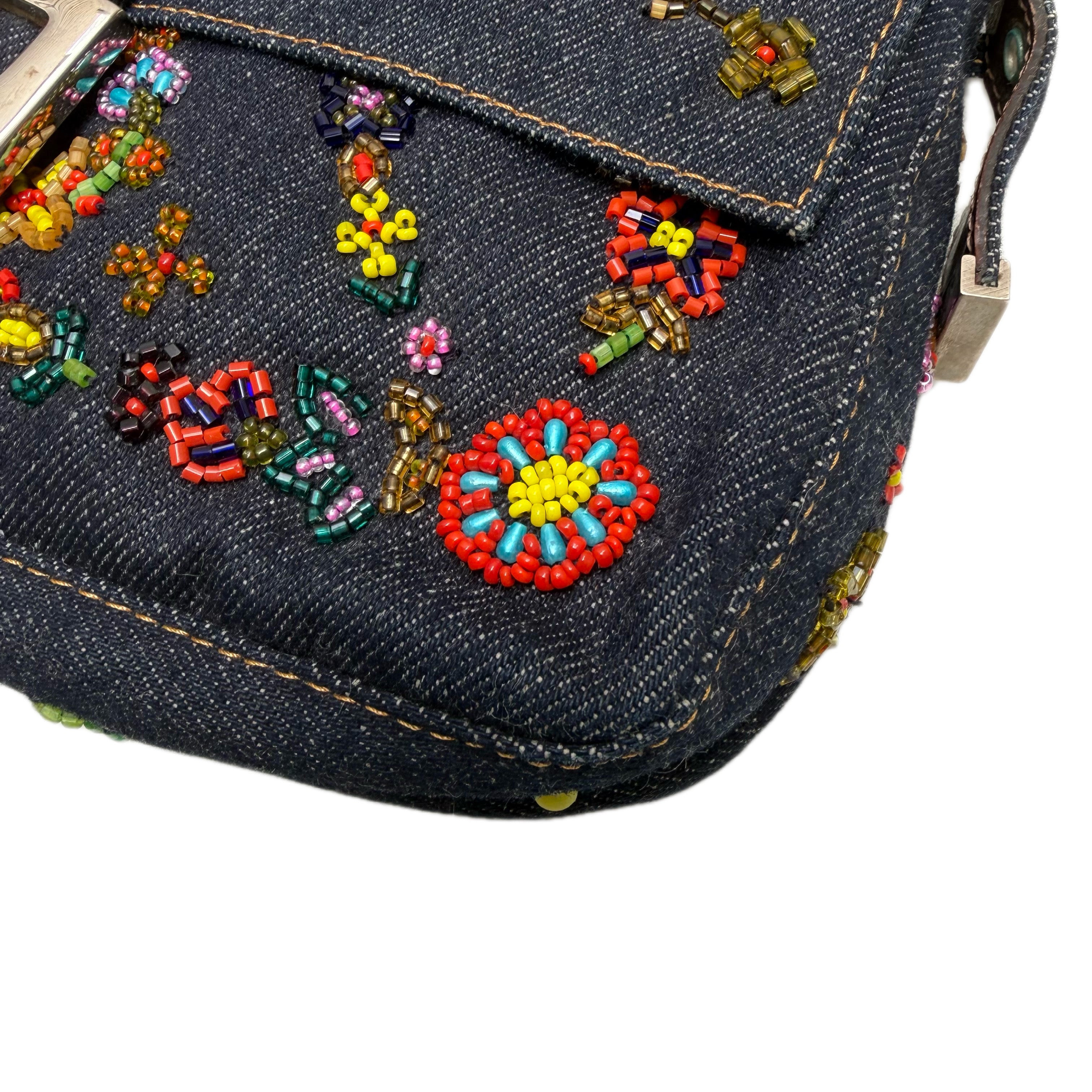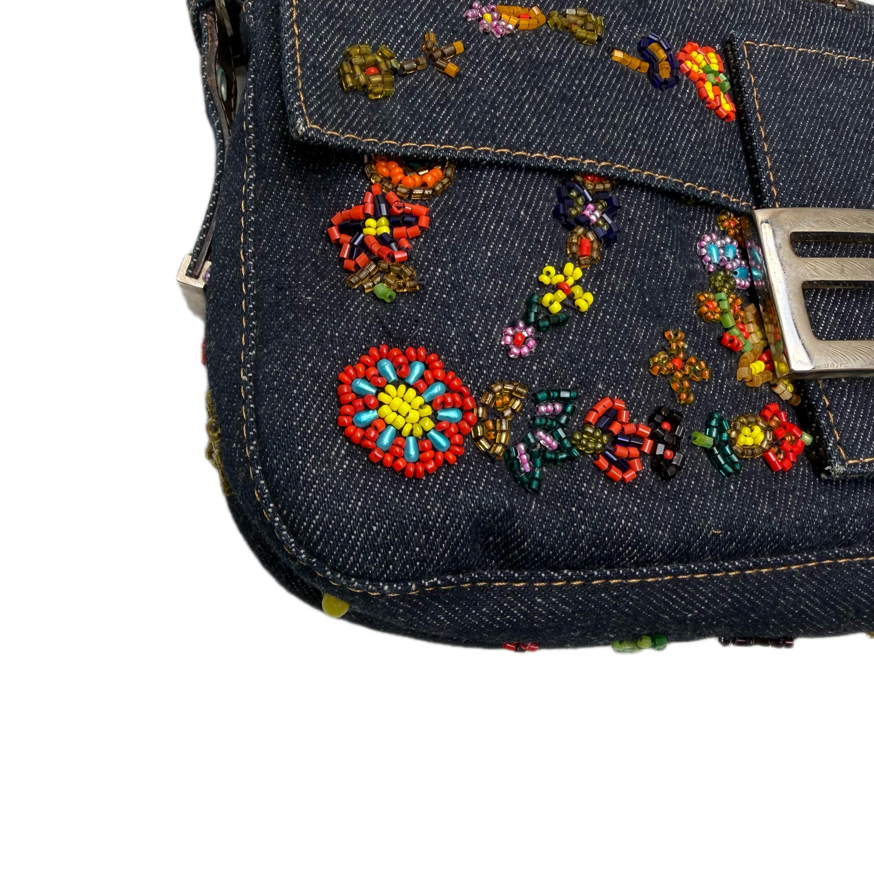 Fendi Denim Floral beaded baguette bag featuring intricate hand-applied bead embellishment and iconic silhouette. Rare collectible piece.