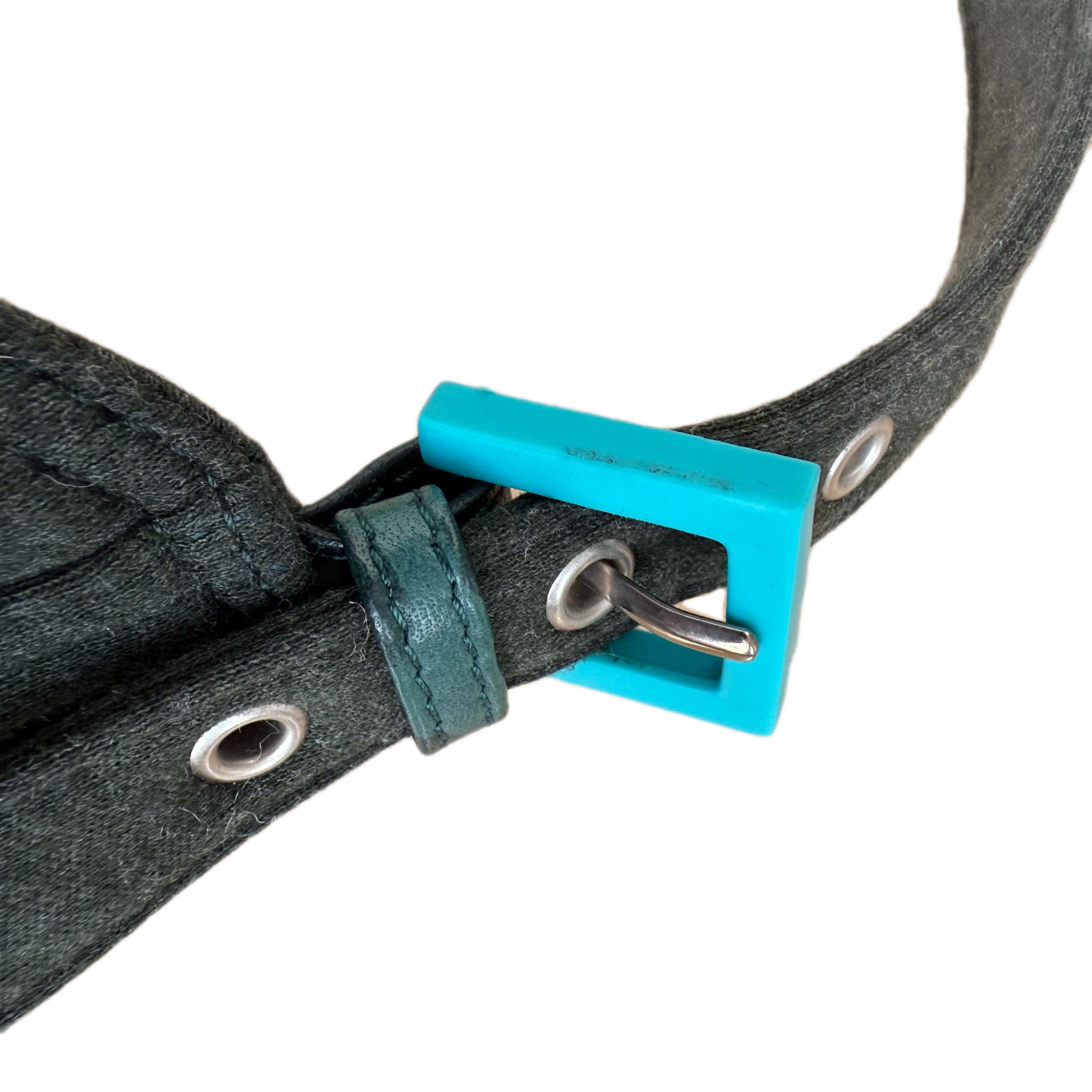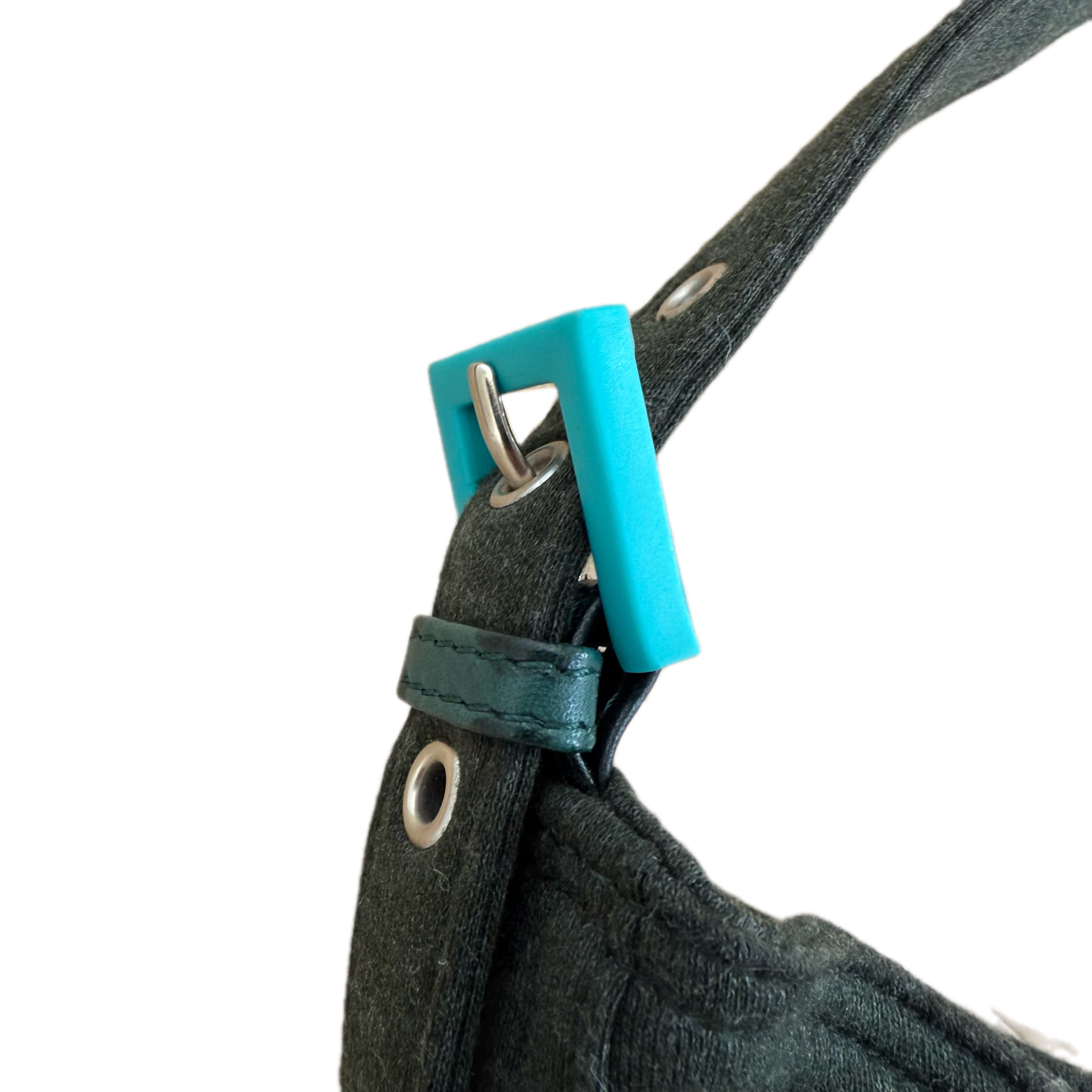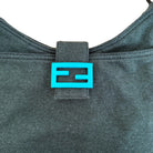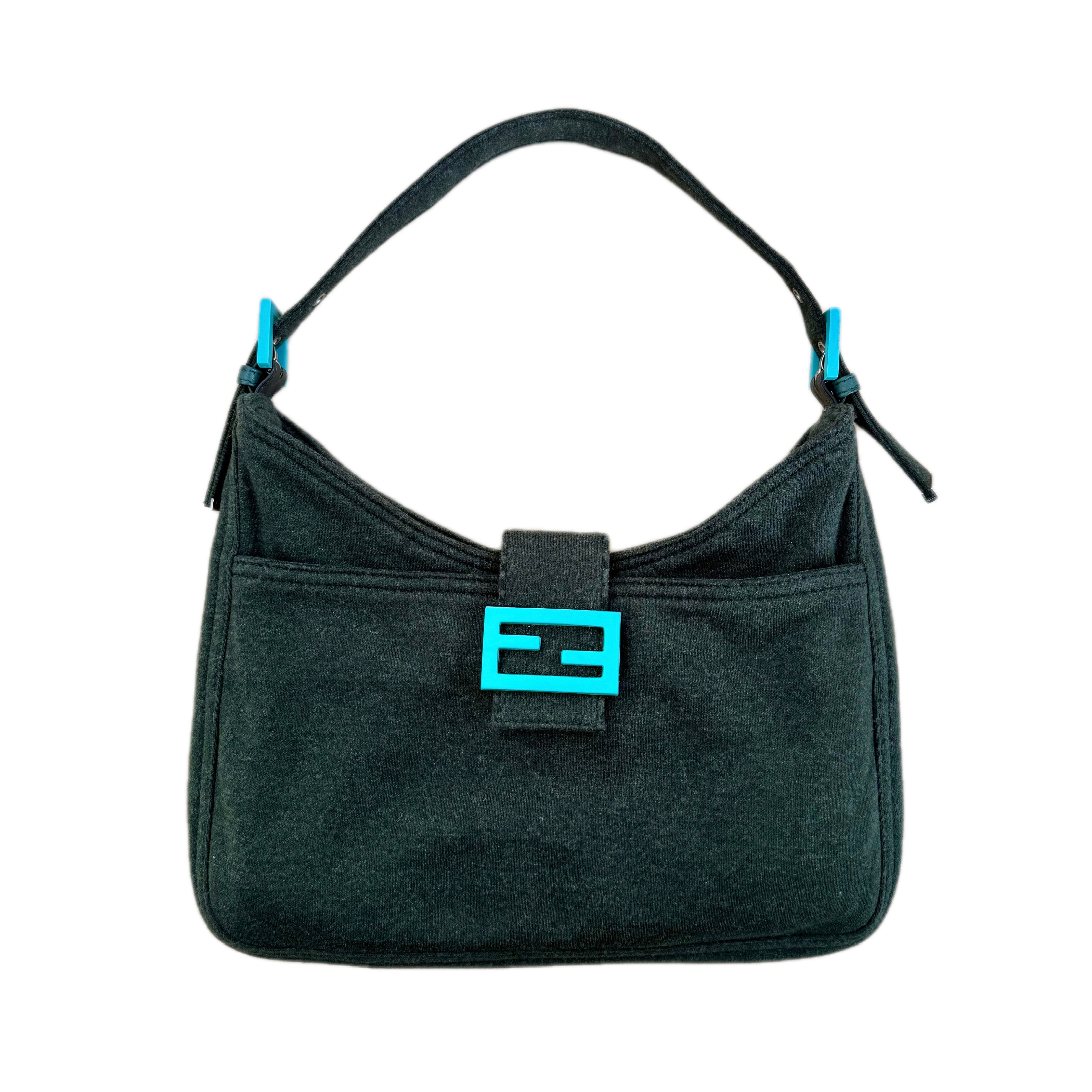 Fendi jersey Double Flap Baguette in dark green with turquoise hardware. Rare archival colorway featuring Fendi’s iconic silhouette and statement hardware.