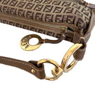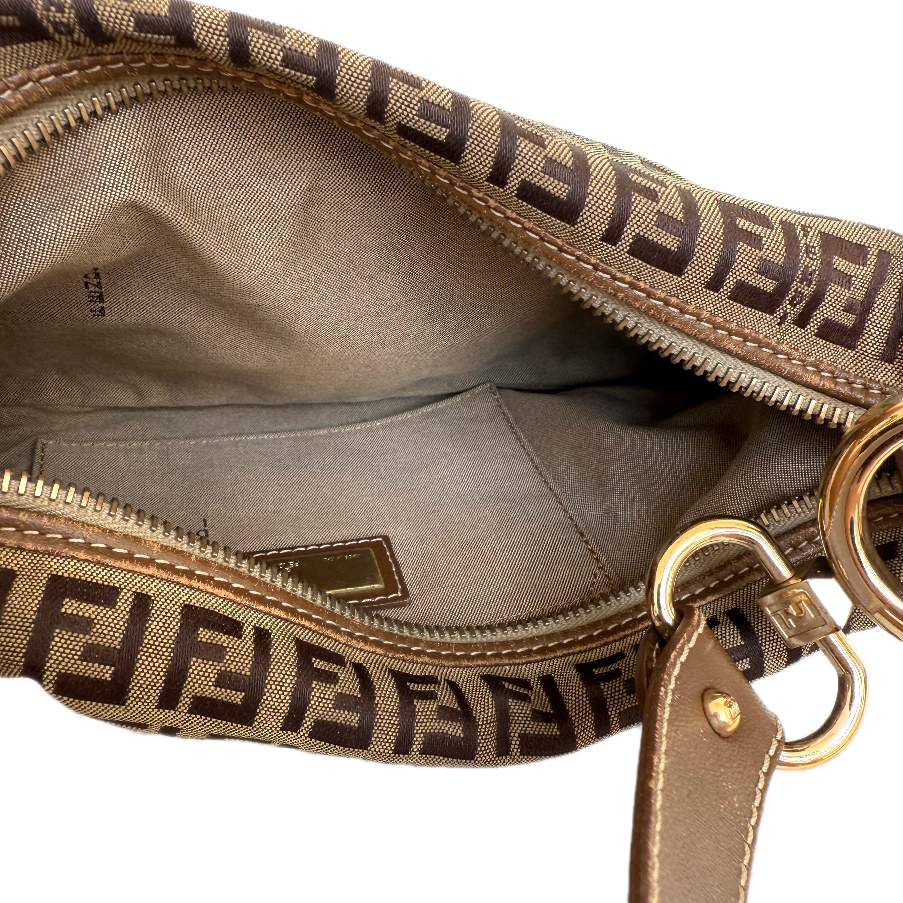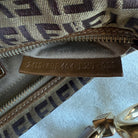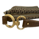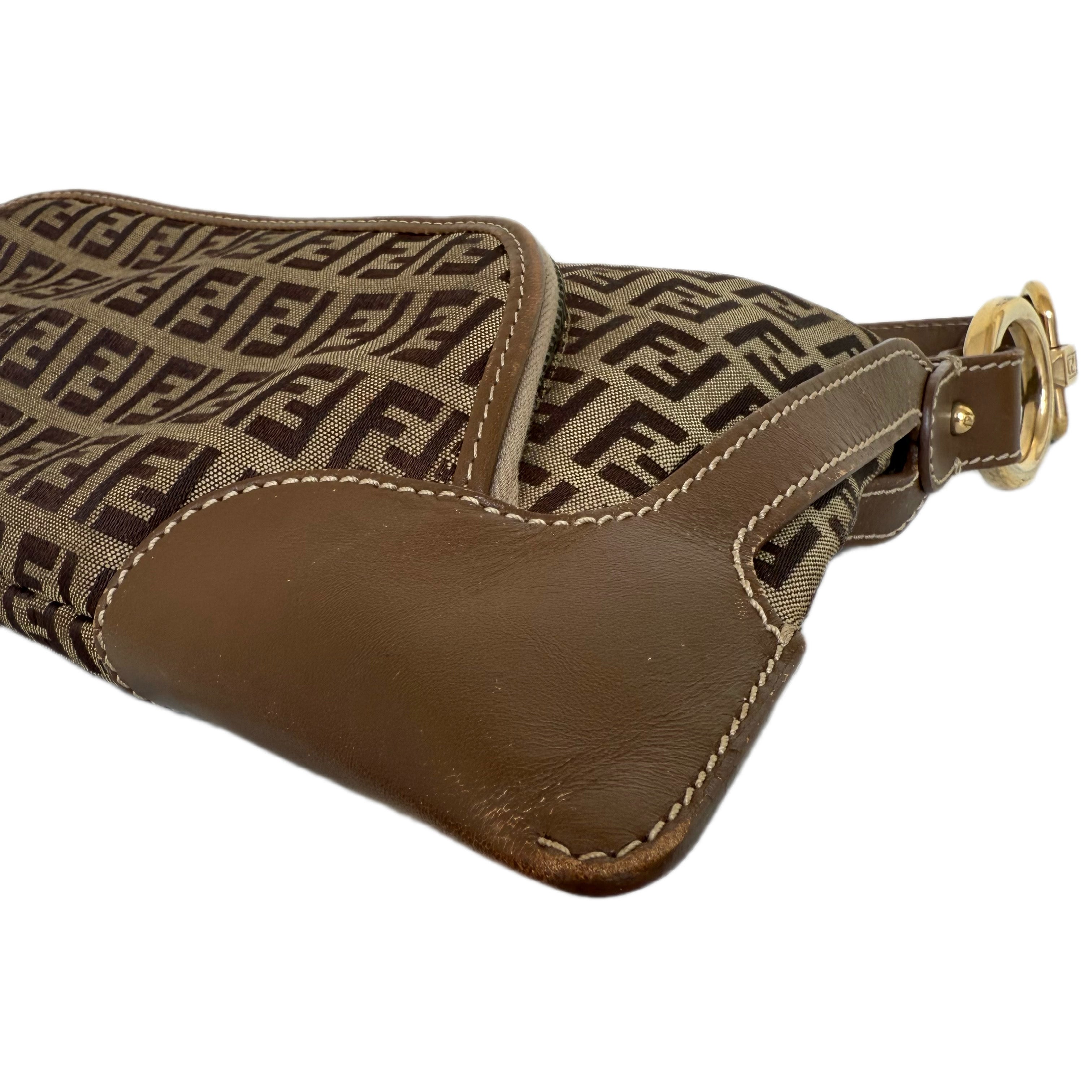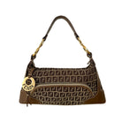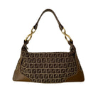Fendi brown Zucchino canvas and leather shoulder bag with front pocket. Classic monogram design with practical everyday functionality.